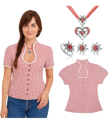 Trachtenbluse Damen Rot Kariert - Traditionelles Karohemd Für Oktoberfest & Volksfeste