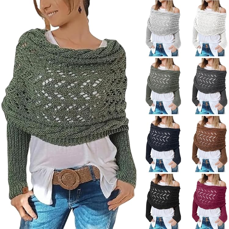 Damen Schal Mit Ärmeln - Gestrickter Zopfmuster Umhang Mit V-Ausschnitt