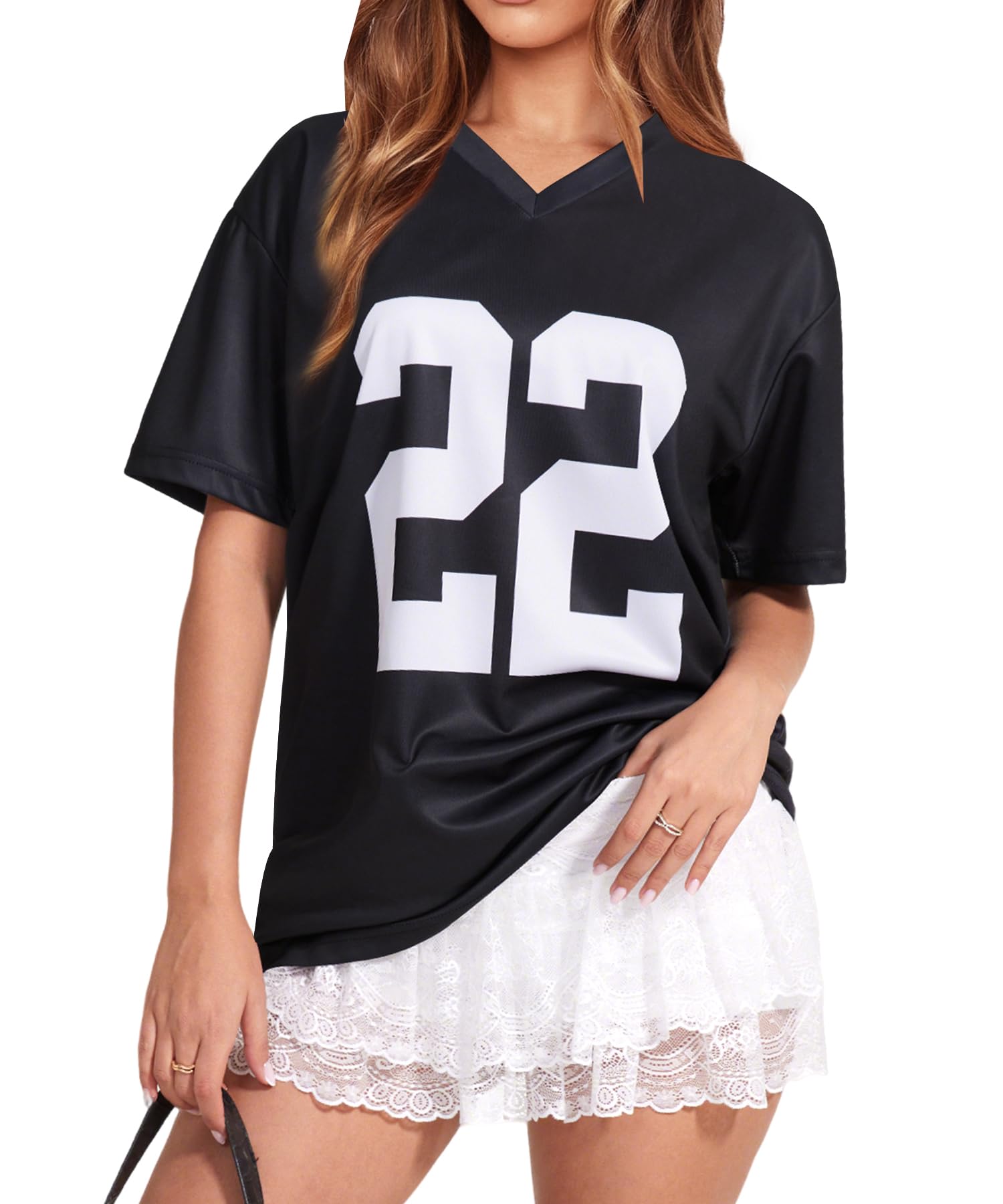 Y2K Retro-Feeling pur! Dieses bauchfreie Oversize Shirt von Navneet bringt den Football-Style der 2000er zurück. Aus 95% Polyester und 5% Elasthan ist das Trikot super bequem, atmungsaktiv und liegt angenehm leicht auf der Haut. Mit V-Ausschnitt, Kontrastfarben in Schwarz-Weiß und der aufgedruckten Nummer 25 vorne und hinten sieht es aus wie ein echtes Football-Trikot - nur stylischer! Perfekt zu Wide-Leg-Hosen, Jeans, Miniröcken oder kombiniert mit Sneakers und Stiefeln. Ob für Sport, Alltag, Parties, Festivals oder Karneval - mit diesem Top bist du immer im Trend. Achtung: Unsere Größen weichen von der Amazon-Standardgrößentabelle ab - bitte vor der Bestellung unbedingt unsere Größentabelle checken für die perfekte Passform!