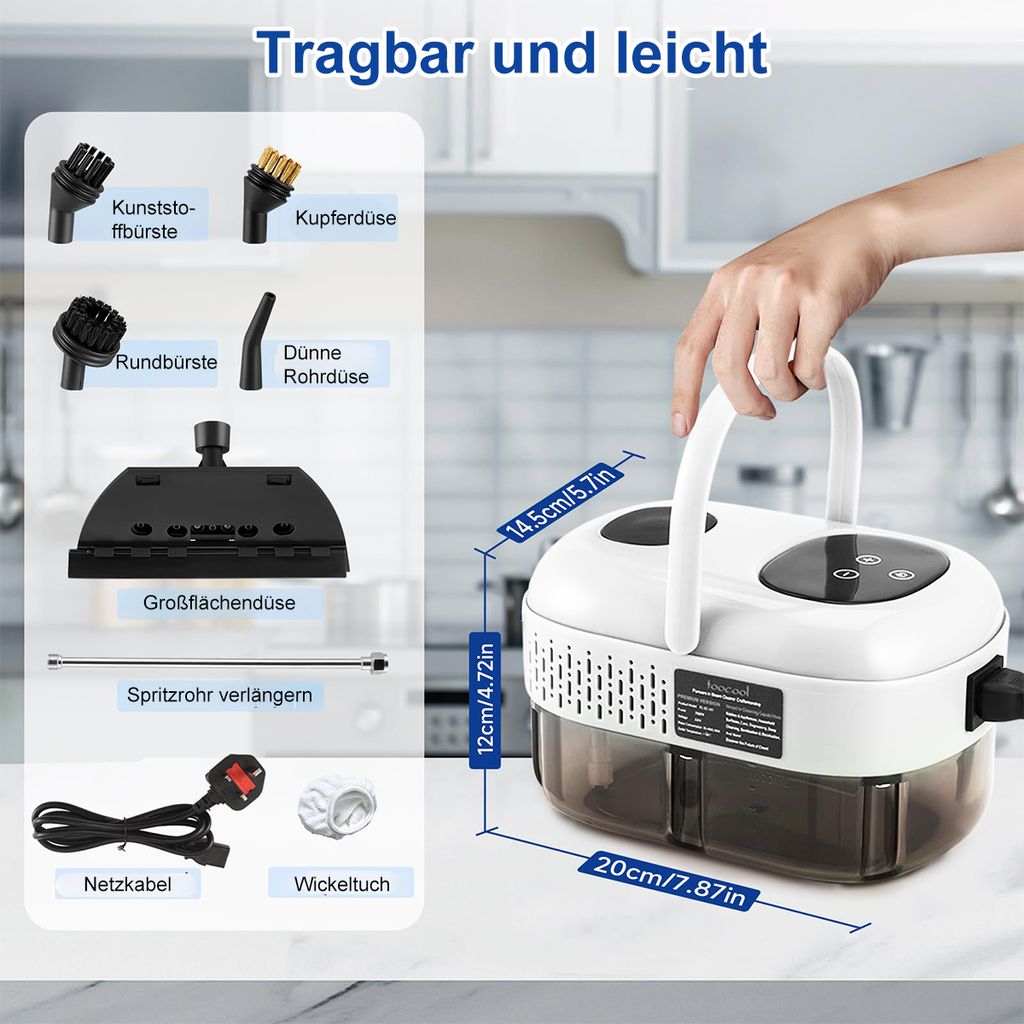 Mensch, dieser Dampfreiniger macht putzen ja fast Spaß! Mit satten 105°C heizt er in nur 3 Minuten auf und löst selbst hartnäckigsten Schmutz und Bakterien. Komplett ohne Chemie - nur mit Wasser! Perfekt für Haushalte mit Kindern, Haustieren oder Allergikern. Der 3,2 Bar Druck pustet Fett, Kalk und Schimmel einfach weg. Mit den 9 verschiedenen Aufsätzen kommst du in jede Ecke - ob Autoinnenraum, Herd, Backofen oder Sofa. Der 250ml Tank reicht für 8-12 Minuten Dampf und das kompakte Design macht ihn super handlich. Einfach Wasser rein, einschalten, warten - und schon geht's los! Keine giftigen Rückstände, kein unangenehmer Geruch, nur blitzblanke Sauberkeit. Ob in der Küche, im Bad oder im Auto - dieser Dampfreiniger ist dein universeller Helfer. Die vielen Aufsätze machen ihn super vielseitig und du sparst dir teure Reinigungsmittel. Einfach bestellen, ausprobieren und sich über strahlende Sauberkeit freuen! Putzen war noch nie so einfach und umweltfreundlich.