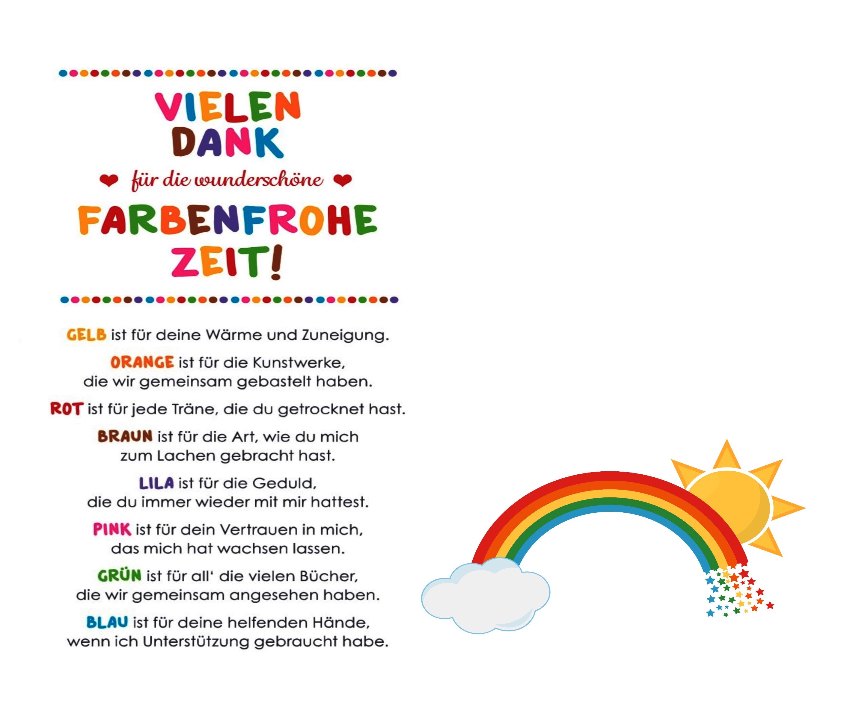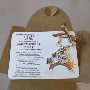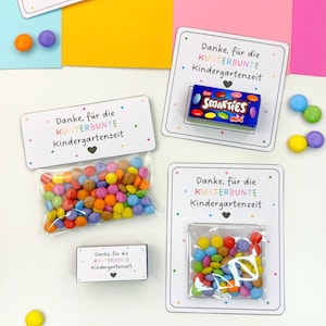 Im Set findest du eine wunderschöne Kerze mit dem Aufdruck \Danke für die kunterbunte Zeit\ und ein niedliches Reagenzglas, das du mit bunten Smarties, Gummibärchen oder anderen kleinen Süßigkeiten füllen kannst.