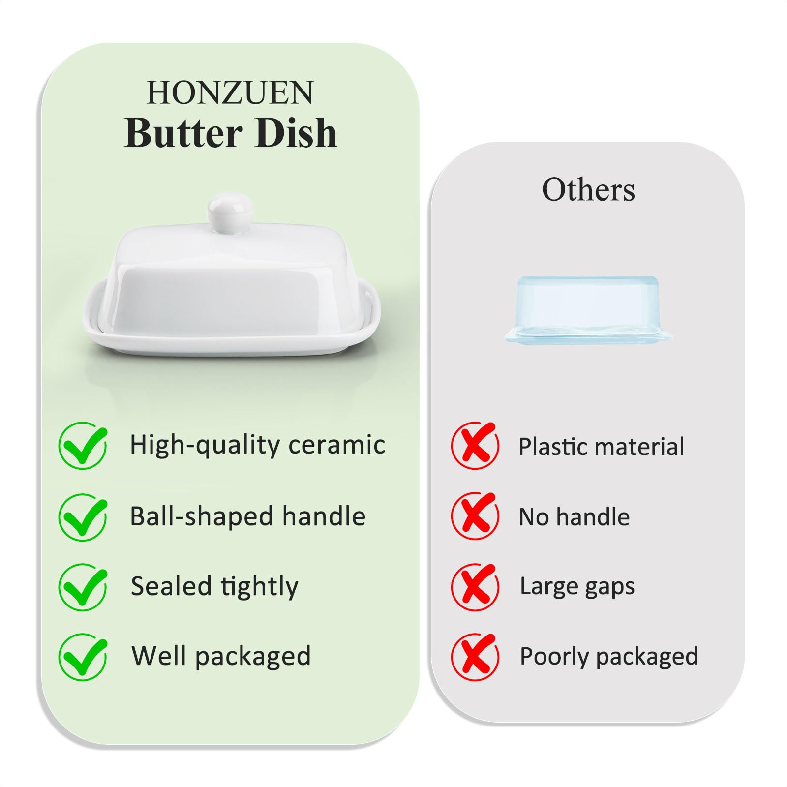 Endlich eine Butterdose, die wirklich praktisch ist! Diese stylische Keramik-Butterdose von HONZUEN bietet Platz für einen ganzen 500g Butterblock - kein lästiges Schneiden mehr nötig. Natürlich passt auch der Standard-250g Block perfekt hinein.\n\nHergestellt aus hochwertiger Keramik, die bei 1350°C gebrannt wurde, ist diese Dose extrem stabil und langlebig. Die kratzfeste Glasur schützt vor Flecken und macht sie spülmaschinenfest. Einfach reinigen und immer hygienisch sauber!\n\nDas elegante 'Butter'-Relief verleiht ihr einen besonderen Charme - ob auf der Arbeitsplatte, im Kühlschrank oder auf dem Esstisch, sie sieht einfach überall gut aus. Maße: 17,5 x 12,3 x 9,5 cm - genau die richtige Größe für den täglichen Gebrauch.\n\nAber sie kann mehr als nur Butter aufbewahren! Perfekt auch für Käse, Snacks oder Desserts. Mikrowellen- und gefrierschrankgeeignet - einfach vielseitig einsetzbar in deiner Küche.\n\nAls Geschenk zur Einweihungsparty, Hochzeit oder einfach nur so - diese Butterdose kommt immer gut an. Praktisch, schön und langlebig - was will man mehr? Deine Butter bleibt frisch und geschützt vor Staub und Gerüchen!