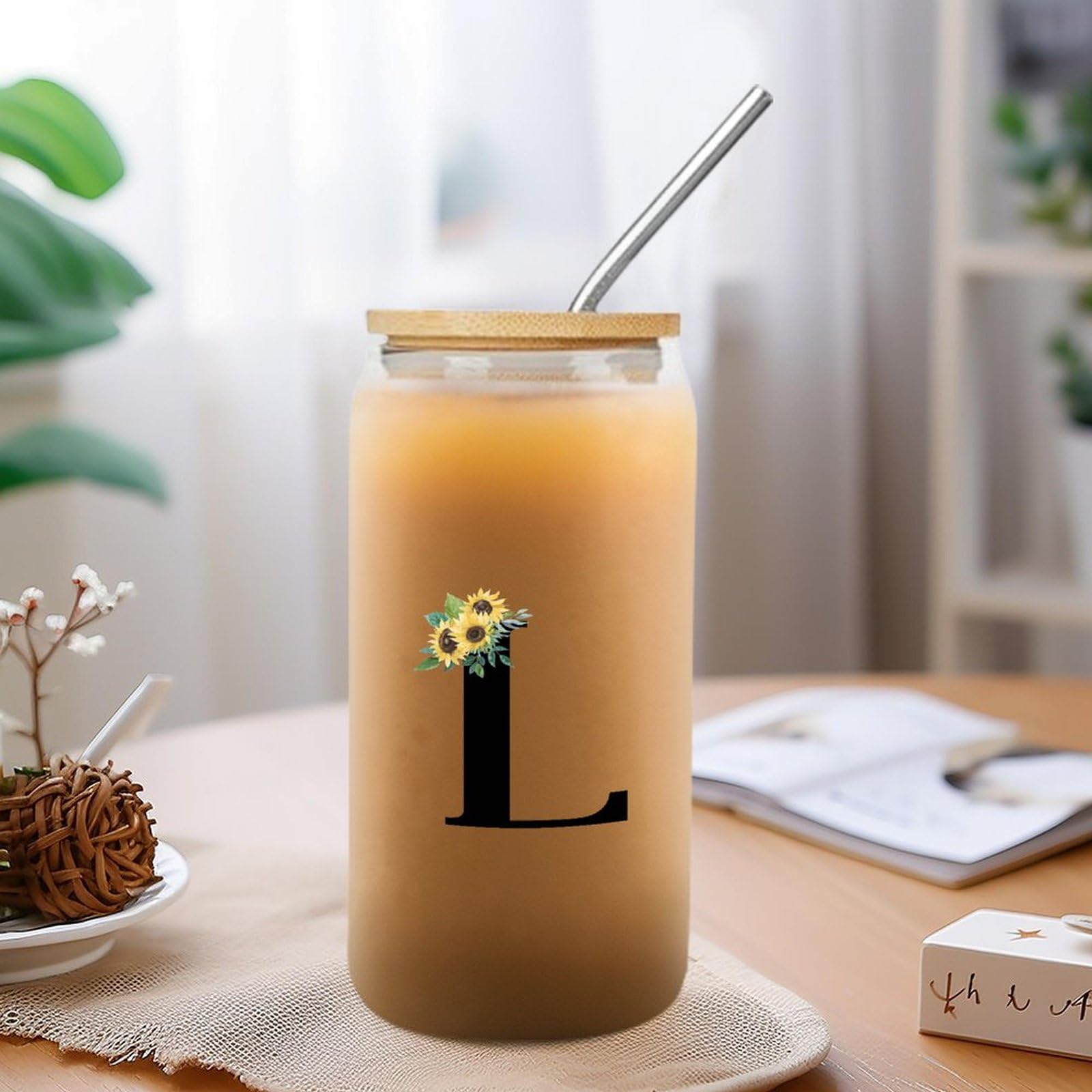 Yelolyio Glasbecher Mit Deckel & Stahl-Strohhalm - 500ml, Personalisiert Mit Buchstabe T