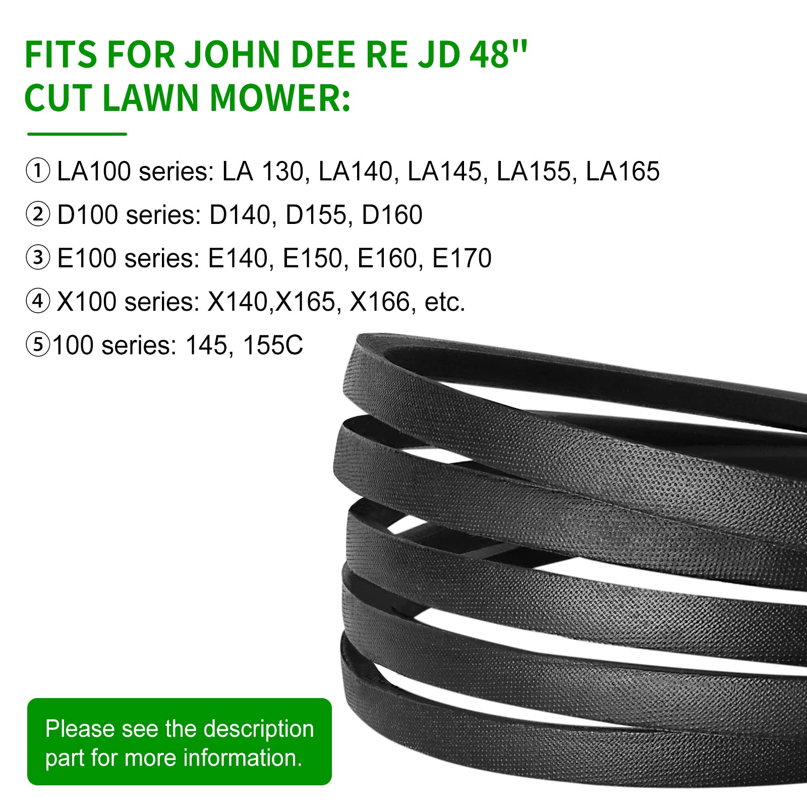 Dein John Deere Rasenmäher macht schlapp? Wahrscheinlich ist der Deckriemen fällig! Dieser hochwertige Ersatzriemen passt perfekt für zahlreiche John Deere Modelle - inklusive D140, D150, D160, LA130, LA145 und viele mehr. Mit den Maßen 1/2 Zoll Breite und 141 1/8 Zoll Länge ist er der exakte Ersatz für das Originalteil GX21833. Das Besondere: Die Kevlar-Verstärkung! Diese High-Tech-Faser macht den Riemen extrem reißfest und langlebig. Er hält höheren Temperaturen stand, ist unempfindlich gegen Öl und zeigt eine hervorragende Abriebfestigkeit - genau das, was du für einen zuverlässigen Mäheinsatz brauchst! Die präzise Passform garantiert eine smooth Leistung deines Mähers - kein Schlupf, keine Leistungsverluste! Einfache Montage - auch für Hobby-Schrauber machbar. Perfekt für den 48-Zoll-Mähdeck, der bei vielen John Deere Modellen verbaut ist. Ob du den Riemen vorbeugend wechseln willst oder er tatsächlich gerissen ist - mit diesem Qualitätsriemen bist du auf der sicheren Seite. Hergestellt mit der gleichen Präzision wie das Original, aber zum fairen Preis! Dein Rasenmäher wird es dir mit zuverlässiger Leistung danken - und dein Rasen sieht wieder perfekt aus. Ein Must-Have für jeden John Deere Besitzer, der Wert auf Qualität und Langlebigkeit legt. Hol dir den Riemen, der hält, was er verspricht!