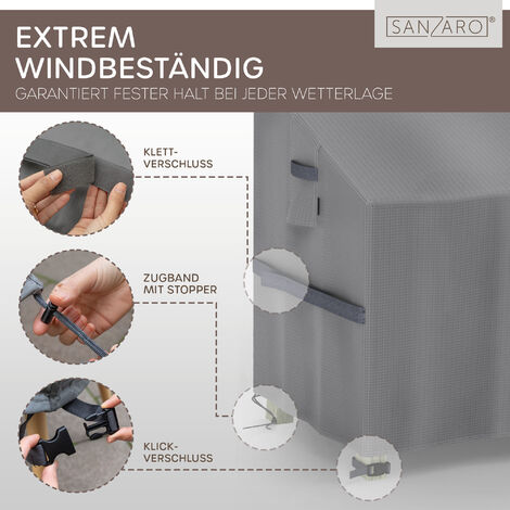 Das trapezförmige Design sitzt perfekt an, der elastische Schnürzug unten hält alles fest - selbst bei Sturm! Die Belüftungsöffnungen an den Seiten verhindern Kondenswasser. Reinigung? Einfach mitm Schlauch abspritzen und trocknen lassen. Nach Regen stehendes Wasser ablassen - so hält die Abdeckung ewig! Kommt mit praktischem Aufbewahrungssack. Deine Möbel sehen aus wie neu - versprochen!
