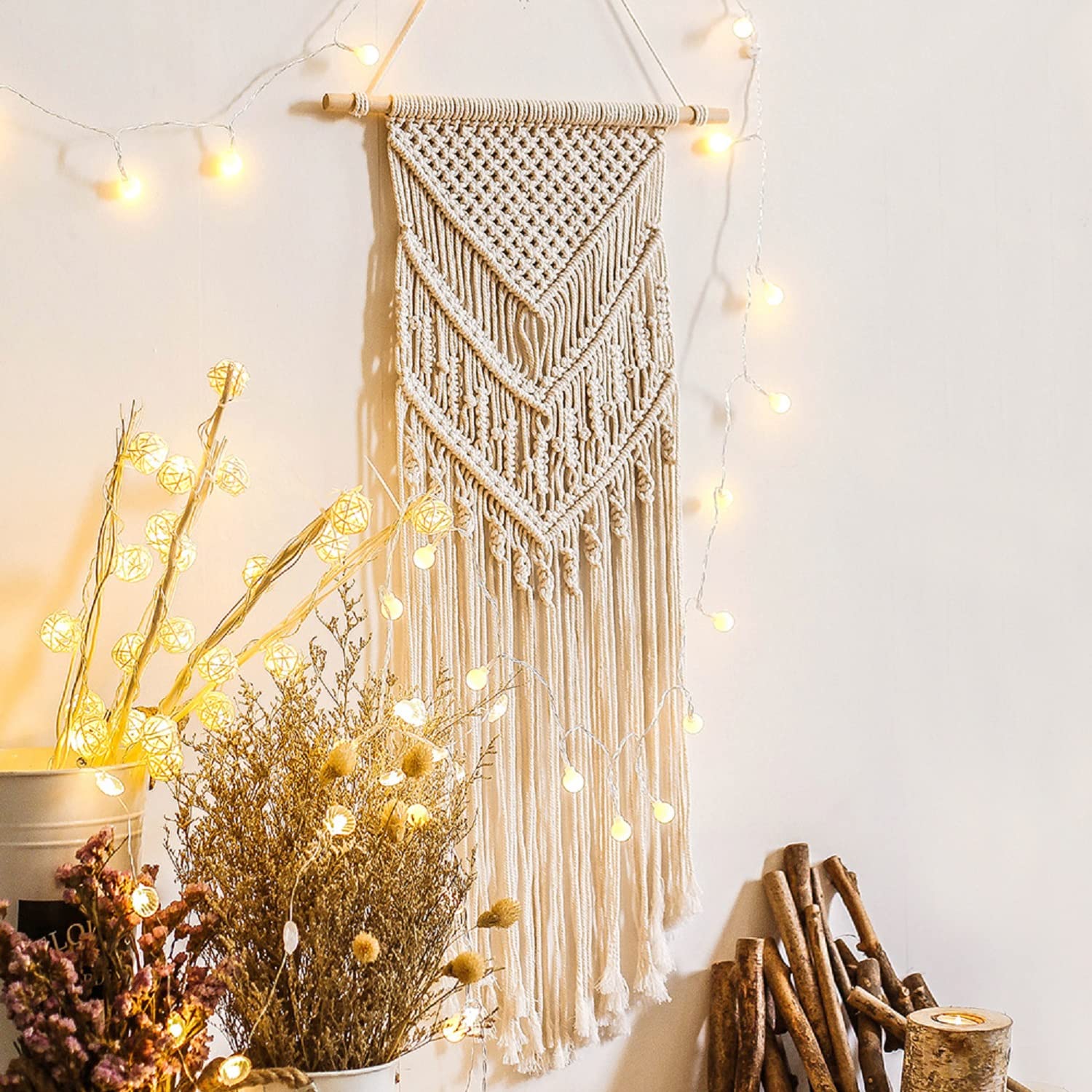 Traumhafter Makramee-Wandbehang im Boho-Stil! Handgewebt aus 100% Baumwolle mit natürlichem Holzdübel. Maße: 40cm breit, 68cm lang (inklusive Fransen). Cremeweiße Farbe passt zu jedem Einrichtungsstil. Perfekt für Schlafzimmer, Wohnzimmer, Wohnheim oder Balkon. Einfache Handwäsche, flach trocknen lassen. Verleiht deinem Zuhause gemütliche Atmosphäre und böhmischen Charme. Auch als Geschenk für Einweihungspartys oder Motto-Events ideal. Umweltfreundlich und ohne unangenehme Gerüche - pure Natur für deine vier Wände!