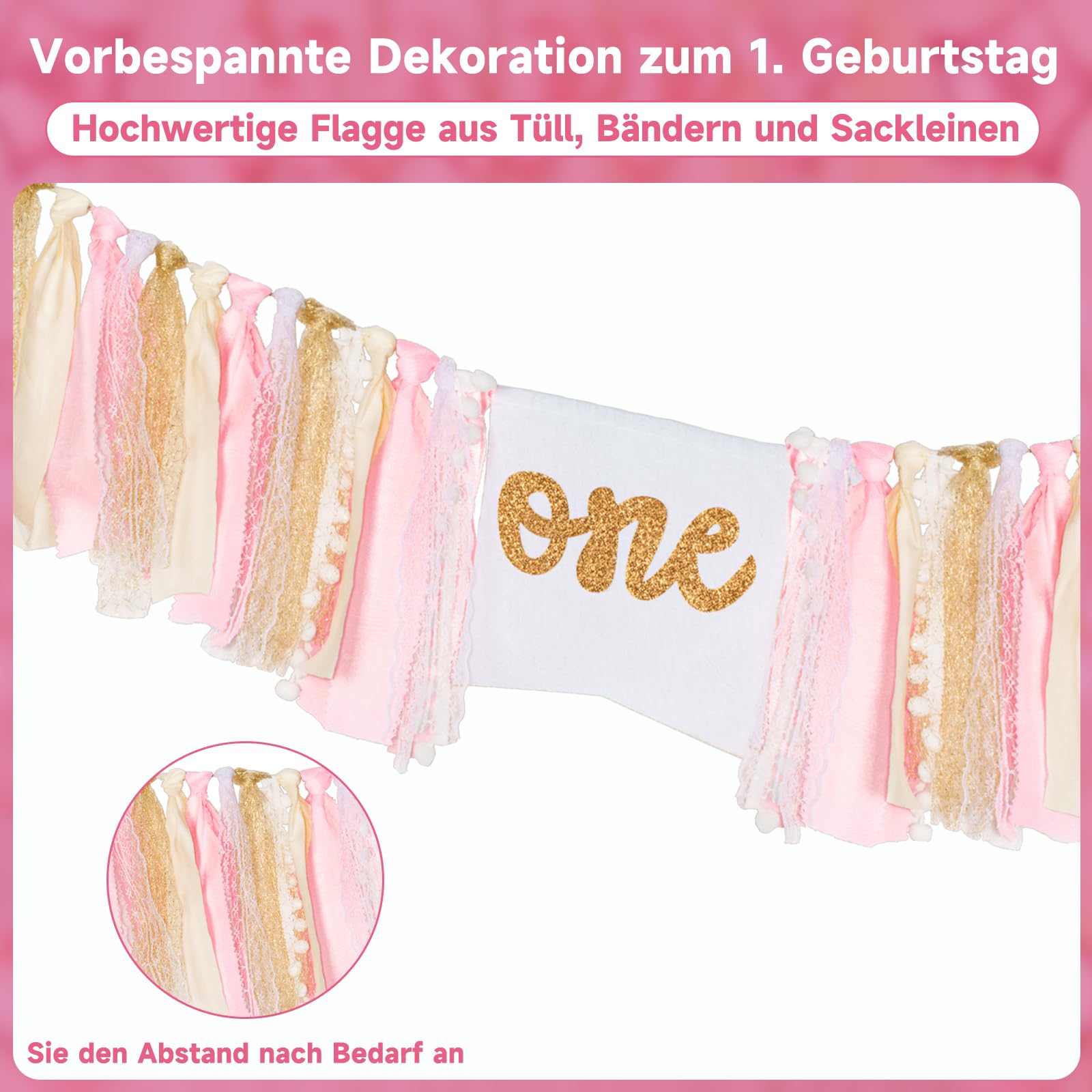 Der erste Geburtstag ist was Besonderes - und mit dieser süßen Deko wird er unvergesslich! Dieses rosa Hochstuhlbanner im Maß 42x17cm (mit 200cm Aufhängeschnur) verwandelt jede Geburtstagsfeier in ein Fest. Aus hochwertigem Polyester gefertigt, ist es langlebig und die leuchtenden Farben bleiben lange schön. Einfach aufhängen - schon ist der Hochstuhl deiner kleinen Prinzessin festlich geschmückt! Aber das Banner kann noch mehr: als Tischdeko, für die Wand oder als Fotohintergrund für die süßesten Erinnerungsfotos. Wiederverwendbar und einfach zu montieren - perfekt für hektische Vorbereitungen. Mach den ersten Geburtstag deines Mädchens zu einem visuellen Highlight, über das alle noch lange reden werden! Die Eltern werden begeistert sein, und die Kleine strahlt um die Wette - versprochen!