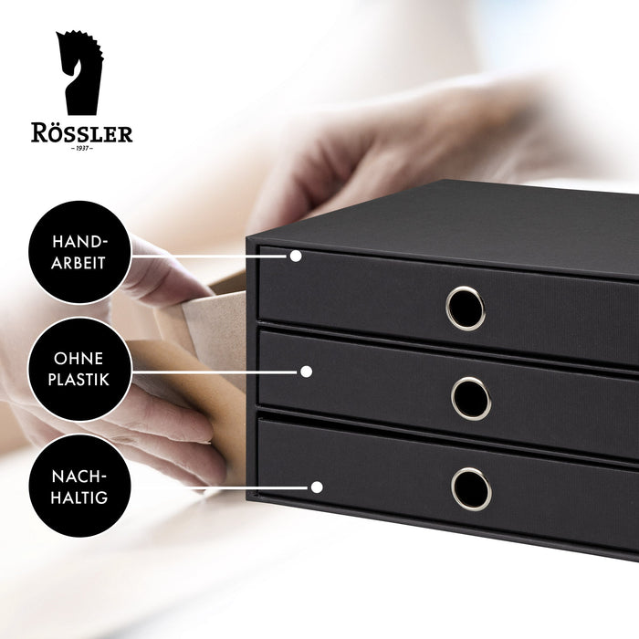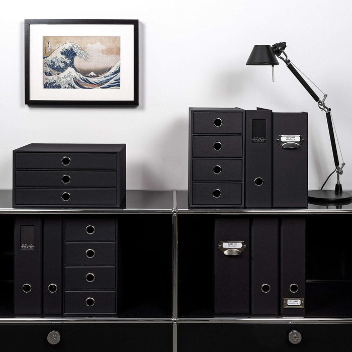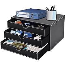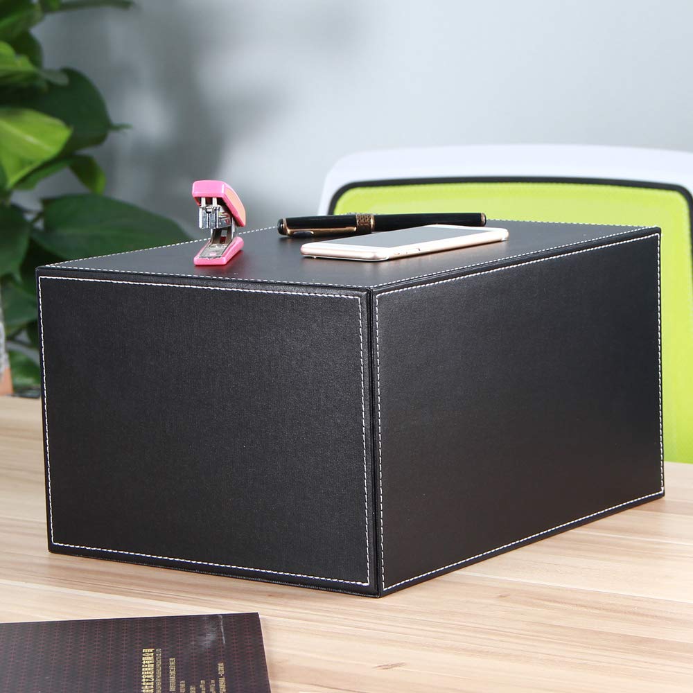 Ordnung muss sein! Diese elegante Schubladenbox aus PU-Leder im klassischen Schwarz macht deinen Schreibtisch sofort aufgeräumter. Mit drei geräumigen Schubladen hast du Platz für A4-Unterlagen, Büromaterial, Schmuck oder Kosmetik. Die geschwungenen Öffnungen sehen nicht nur schick aus, sondern machen den Zugriff super einfach. Innen sorgt MDF mit weichem Flanell für Stabilität und Schutz deiner Sachen. Maße: 33x25x18,5cm - perfekt für Büro, Homeoffice oder Wohnzimmer. Endlich alles griffbereit und trotzdem stylisch versteckt. Ein echter Hingucker, der praktischer nicht sein könnte!