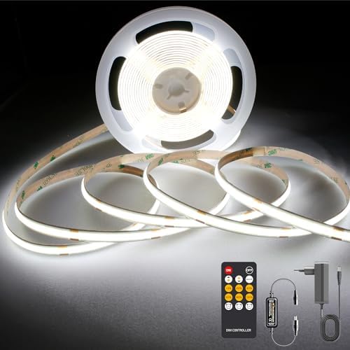 Wow, diese COB LED Streifen von PSTAR sind einfach der Hit für coole Beleuchtungslösungen! Mit 4m Länge und 320 LEDs pro Meter strahlen sie in wunderschönem warmweißem Licht (2700K). Das Besondere: COB-Technologie sorgt für eine super gleichmäßige Ausleuchtung ohne diese lästigen dunklen Flecken, die man von normalen LED-Streifen kennt. Perfekt für deine Augen! Du kannst die Streifen ganz einfach alle 5,2cm zuschneiden und dank der starken Klebebeschichtung an fast jeder glatten Oberfläche anbringen. Mit nur 8mm Breite passen sie auch in super enge Ecken. Die mitgelieferte RF-Fernbedienung ist genial - damit dimmst du die Helligkeit stufenlos von 10% bis 100%. Und das LED-Band merkt sich sogar deine letzte Einstellung! Mit 180° Abstrahlwinkel beleuchten die Streifen eine richtig große Fläche. Ob hinter dem Fernseher für gemütliches Kino-Feeling, in Regalen für coole Akzente oder unter Schränken für praktische Arbeitsbeleuchtung - deiner Kreativität sind keine Grenzen gesetzt! Die 24V Betriebsspannung ist sicher und die Lebensdauer von 50.000 Stunden bedeutet: Jahre lang keine Sorgen mit Beleuchtung! Einfach anbringen, Fernbedienung in die Hand und schon hast du professionelle Beleuchtung wie aus dem Möbelhaus - nur viel günstiger! Für DIY-Projekte absolut perfekt. Deine Wohnung wird damit richtig gemütlich! Probier's aus - du wirst begeistert sein!
