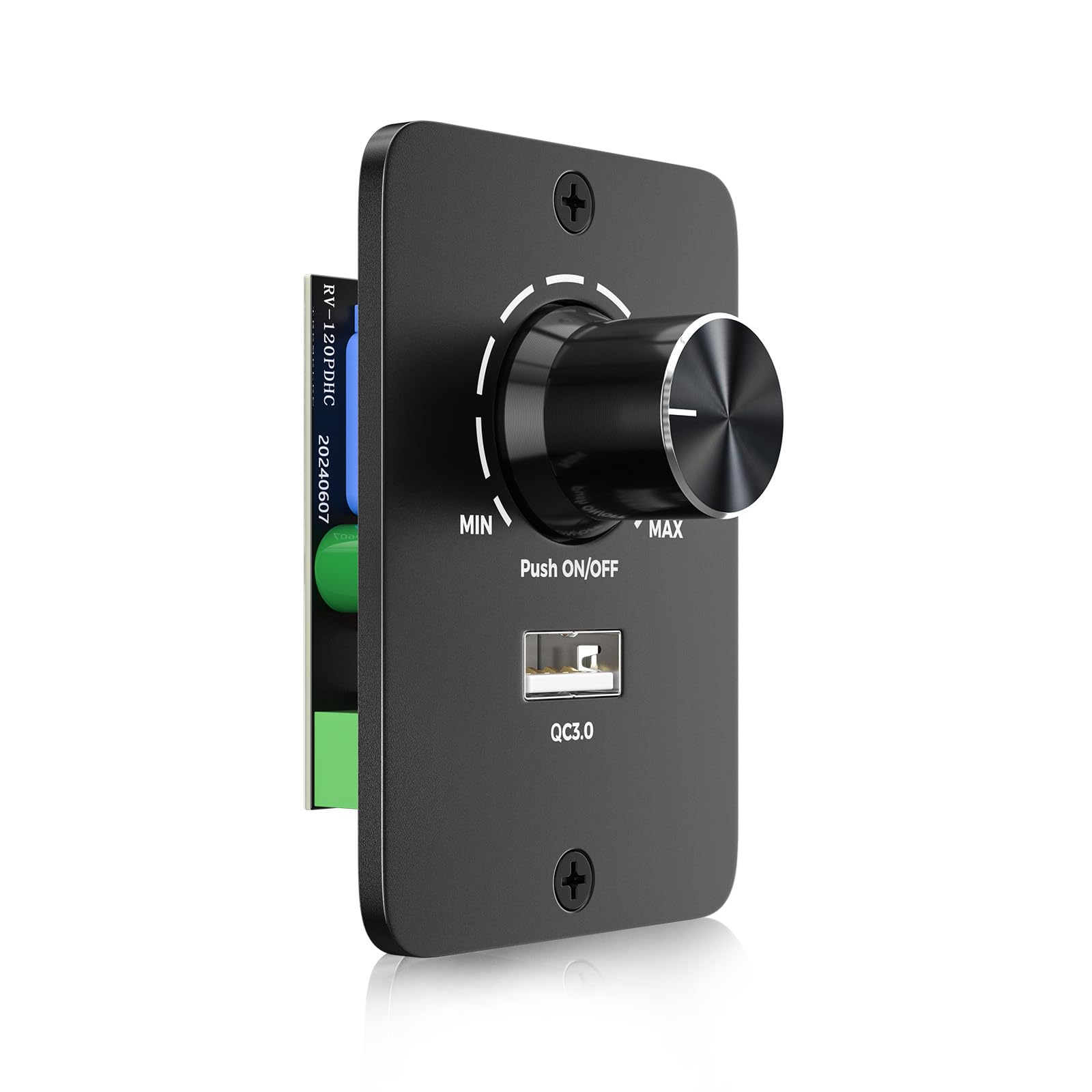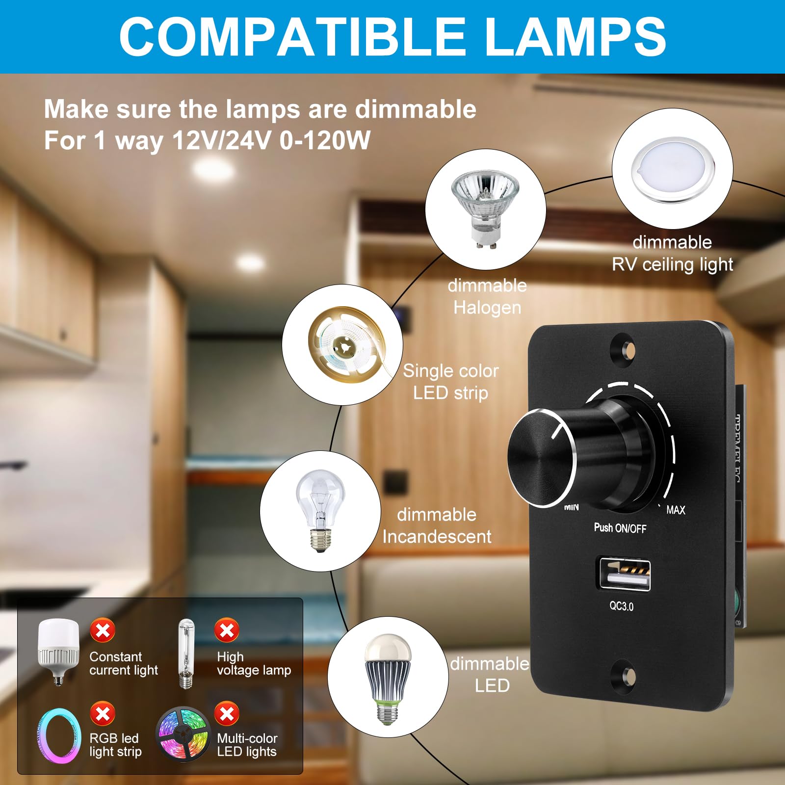 Perfekte Lichtstimmung für dein Wohnmobil, Boot oder LKW! Dieser LED Dimmer mit PWM-Technologie gibt dir volle Kontrolle über deine Beleuchtung. Von 0-100% stufenlos dimmbar - ganz ohne Flackern.\n\nDas besondere Feature: Integrierter USB QC3.0 Schnellladeanschluss mit bis zu 24W Leistung. So kannst du gleichzeitig deine Beleuchtung steuern und dein Smartphone oder Tablet laden.\n\nTechnische Daten:\n• Spannung: 12-24V DC\n• Strom: 5A max\n• Leistung: 60W bei 12V, 120W bei 24V\n• USB: QC3.0, 3-12V, 24W max\n• Anschluss: 3 Drähte (V+, L+, V-)\n\nPraktische Memory-Funktion: Merkt sich deine letzte Helligkeitseinstellung - auch nach Stromausfall. Kein lästiges Nachjustieren nötig!\n\nEinfache Installation:\n• V+ zur Stromquelle\n• L+ zur Lampe\n• V- gemeinsam anschließen\n• Abnehmbare Frontplatte für individuelle Einbau\n\nKompatibel mit:\n• Dimmbaren LEDs\n• Halogenlampen\n• Glühlampen\n• Einfarbigen LED-Streifen\n\nOb für gemütliche Abende im Wohnmobil, praktische Beleuchtung im Boot oder professionelle Anwendungen - dieser Dimmer macht alles möglich. Hol dir die perfekte Lichtstimmung für jede Situation!