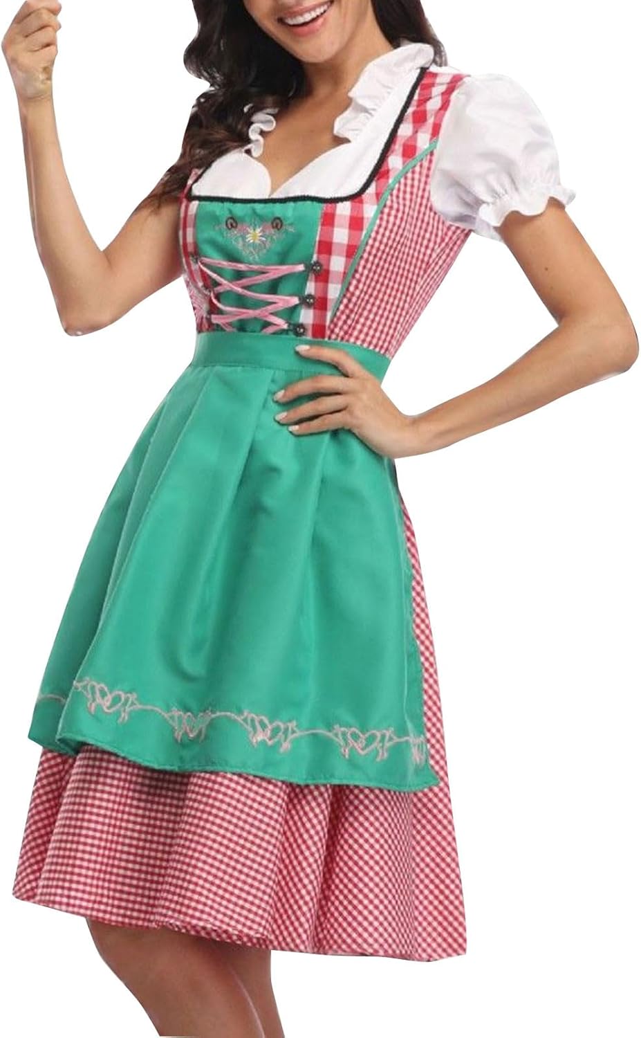 Oktoberfest-Feeling pur! Dieses wunderschöne Dirndl in Übergrößen lässt jede Frau strahlen. Das Set besteht aus Kleid und separater Schürze - beide aus weicher, hautfreundlicher Baumwolle für maximalen Tragekomfort. Die verstellbare Schürze (ca. 53cm lang) betont deine Taille perfekt. Romantische Bordüren, dekorative Korsetthaken und ein elegantes Seidenband machen dieses Dirndl zum absoluten Hingucker. Der Midi-Länge sorgt für einen klassischen Look, während der dehnbare Stoff sich sanft an deine Figur anschmiegt. Perfekt nicht nur fürs Oktoberfest, sondern auch für Karneval, Mottopartys oder Hochzeiten. Achte unbedingt auf die Größentabelle - unsere Größen weichen von Amazon-Standards ab! Durch handgenähte Details ist jedes Stück ein kleines Unikat. Von Grün über Blau bis Rot - finde deine Lieblingsfarbe und werde zur Königin des Fests. Mit diesem Dirndl fällst du garantiert positiv auf - ob beim Maßkrug-Stemmen oder auf der Tanzfläche!