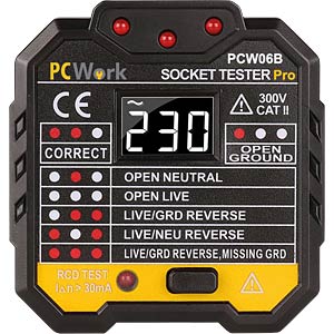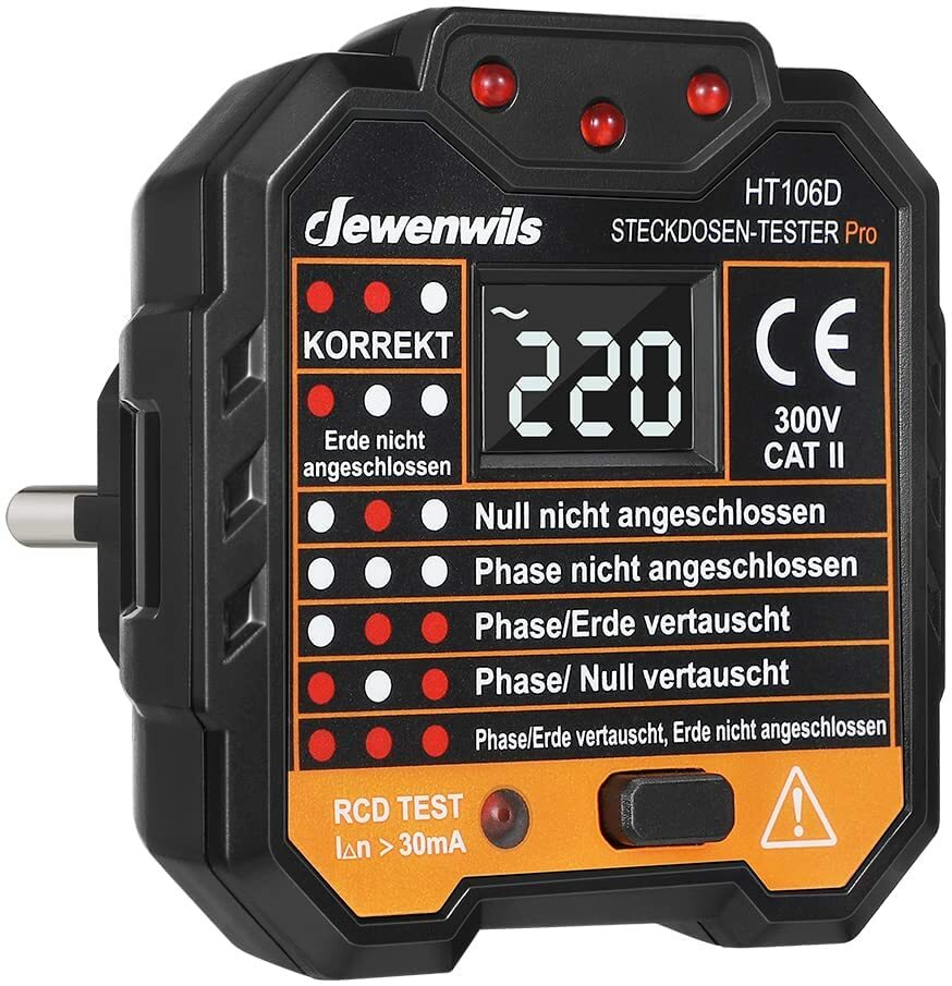 Für alle die's genau wissen wollen: Dieser Profi-Steckdosentester checkt deine Steckdosen im Handumdrehen! Einfach einstecken und das klare LCD-Display zeigt sofort die Spannung an (90-250V). Prüft bis zu 6 verschiedene Verdrahtungsfehler - ob Phase vertauscht, Erdung fehlt oder was auch immer. Mit praktischem RCD-Test: Ein Knopfdruck checkt ob der FI-Schutzschalter bei 30mA zuverlässig auslöst. CAT II 300V zertifiziert - also absolut sicher in der Anwendung. Perfekt für Elektriker, Heimwerker oder einfach für den Hausgebrauch. Die LED-Anzeigen leuchten auch bei Dunkelheit - super praktisch! Nie wieder unsicher sein ob die Steckdose richtig verdrahtet ist. Einfach einstecken, ablesen und Bescheid wissen - dein Sicherheits-Check für jede Steckdose!