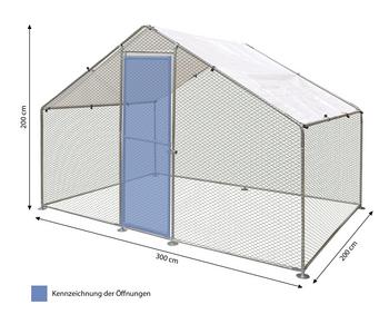 Dein Vierbeiner braucht mehr Auslauf? Mit diesem riesigen Außengehege schaffst du den perfekten Freilauf im Garten! Mit stolzen 200x300x200cm bietet es reichlich Platz zum Toben und Spielen - ob für Hunde, Hühner oder andere Haustiere.\n\nAus robustem, verzinktem Metall gefertigt, hält dieses Gehege wirklich jedem Wetter stand. Kein Rost, keine Witterungsschäden - einfach jahrelang Freude am sicheren Auslauf. Das Sicherheitsschloss an der Tür sorgt dafür, dass dein Liebling auch wirklich drin bleibt.\n\nDer Aufbau ist super einfach - keine komplizierte Bastelei, sondern schnell einsatzbereit. Perfekt für den Garten, Hof oder jede andere Außenfläche. Dein Tier hat seinen eigenen sicheren Bereich, wo es sich austoben kann, ohne dass du dir Sorgen machen musst.\n\nOb als dauerhafter Freilauf oder temporäre Lösung - dieses Gehege ist extrem vielseitig einsetzbar. Und das Beste: Es sieht nicht nur praktisch aus, sondern ist auch ein echter Hingucker im Garten. Dein Tier wird's lieben - und du die Ruhe!