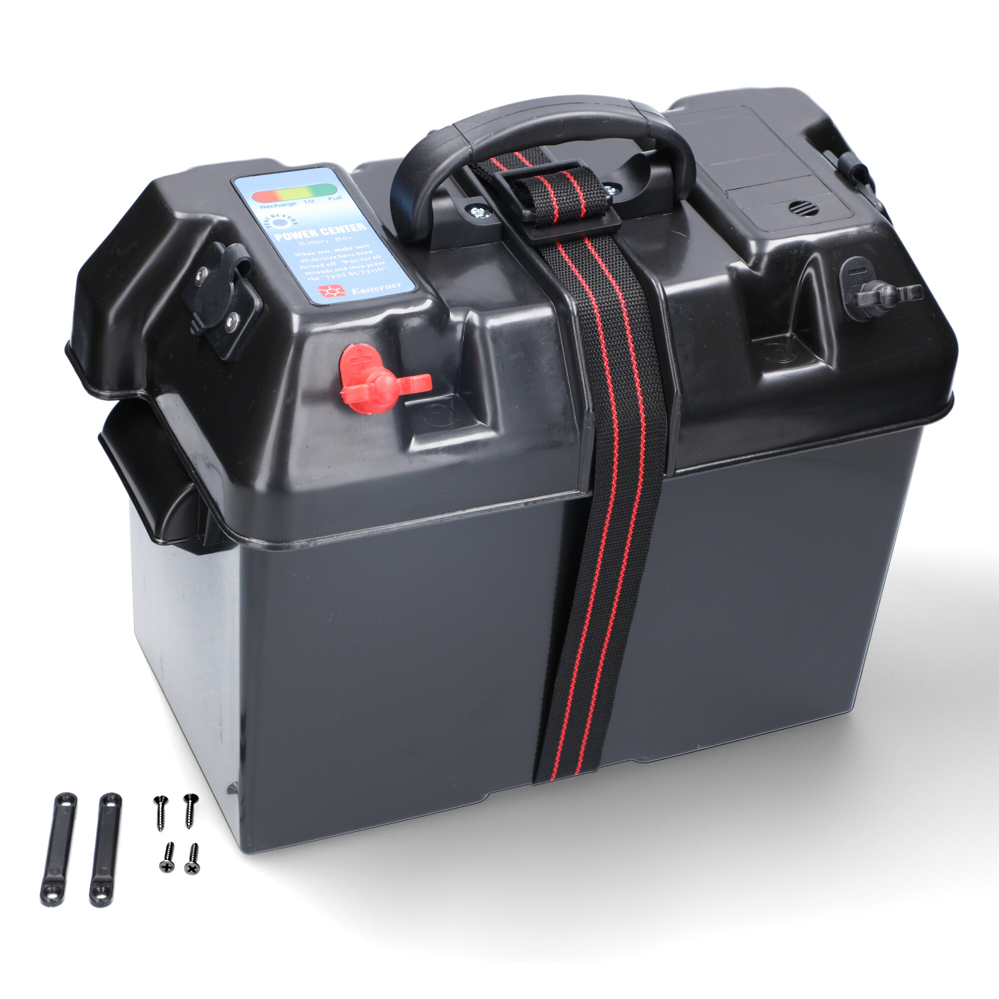 Deine Batterien sind damit bestens geschützt! Diese robuste Batteriebox aus PP-Material hält deine Akkus sicher und trocken - perfekt für Boote, Wohnmobile oder Camping-Ausflüge. Mit praktischem Tragegriff und zwei USB-Anschlüssen kannst du direkt deine Geräte aufladen. Die LED-Anzeige zeigt dir immer den aktuellen Batteriestatus an. Einfacher Ein-/Ausschalter für mehr Sicherheit, Schnellanschlussklemmen und Überlastungsschutz sind inklusive. Maße: 44x24,5x27 cm. Wird mit Befestigungsgurt und Montagezubehör geliefert. Achtung: Batterien sind nicht enthalten! So macht Outdoor-Strom Spaß - sicher, praktisch und zuverlässig.
