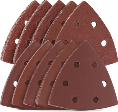 Riesiges Schleifpapier-Set für deine Dreieckschleifer! Mit 120 Teilen und 8 verschiedenen Körnungen bist du für jede Schleifarbeit bestens ausgestattet. \\n\\nTechnische Details:\\n- Menge: 120 Stück\\n- Größe: 93x93x93 mm\\n- 6 Löcher für Staubabsaugung\\n- Klettverschluss-Rückseite\\n- Körnungen: 40, 60, 80, 120, 180, 240, 320, 400\\n\\nDas bedeutet: Von grobem Materialabtrag bis zum Feinschliff ist alles dabei! \\n\\nEinsatzgebiete:\\n- Holz schleifen und glätten\\n- Metall entgraten\\n- Kunststoff bearbeiten\\n- Lacke abschleifen\\n- Und vieles mehr!\\n\\nDas Aluminiumoxid-Material ist verschleißfest und langlebig. Die Klett-Rückseite hält bombenfest, und die Löcher sorgen für weniger Staub. \\n\\nPerfekt kompatibel mit allen 93mm Dreieckschleifern. Ob Heimwerker oder Profi - mit diesem Set hast du lange was davon! \\n\\nTipp: Immer mit Handschuhen und Schutzbrille arbeiten - Sicherheit geht vor!