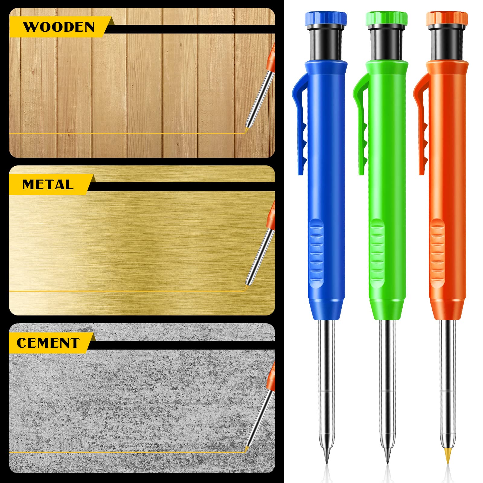 Wow, dieses cobee Set ist genau das Richtige für alle Handwerker und Hobby-Heimwerker! 🛠️\n\nDu kriegst 2 robuste Zimmermannsbleistifte in schwarz und blau PLUS 2 Boxen mit Ersatzminen in rot, gelb und schwarz. Die Stifte sind aus Metall und ABS - richtig stabil und liegen gut in der Hand.\n\nDas coole Feature: Die ultra-lange 45 mm Spitze kommt auch in die engsten Ecken und Löcher! Da kommen andere Marker nicht hin. Perfekt für präzise Markierungen an schwer zugänglichen Stellen.\n\nDie Minen sind aus speziellem Wachs - die kannst du auf fast allem verwenden: Holz, Metall, Kunststoff, Glas, sogar auf öligen oder nassen Oberflächen! Und wenn du mal daneben markierst, einfach mit einem feuchten Tuch abwischen - spurlos verschwunden!\n\nNoch ein Highlight: Der integrierte Spitzer in der Stiftspitze! Immer eine scharfe Spitze parat, ohne dass du irgendwas verlieren kannst. Das Clip-Design an der Seite ist super praktisch - einfach an die Tasche stecken und schon geht's los.\n\nDie Rillen am Stift geben dir einen rutschfesten Griff - selbst bei langen Arbeiten tut dir die Hand nicht weh. Egal ob du auf der Baustelle, in der Werkstatt oder beim DIY-Projekt zu Hause arbeitest - mit diesen Bleistiften machst du nichts verkehrt!\n\nLieferumfang: 2 Zimmermannsbleistifte, 2 Minen-Boxen. Einfach auspacken und loslegen!