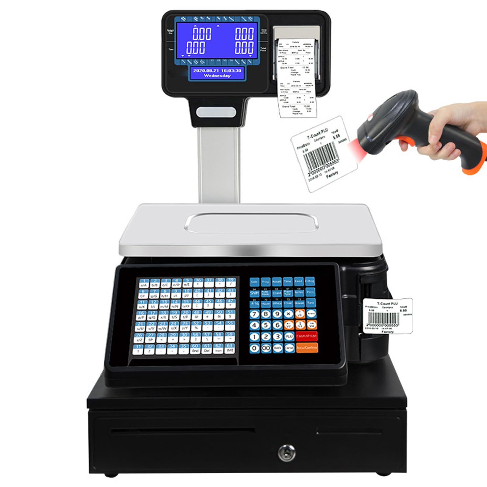 Perfekte Waage für Ihren Supermarkt oder Laden! Diese Kassenwaage wiegt bis zu 30kg und druckt gleichzeitig Quittungen - total praktisch. Mit klarem LCD-Display siehst du Gewicht und Preis auf einen Blick. Die Waage spricht übrigens deine Sprache, denn du kannst sie ganz einfach einstellen. Ob für Obst, Gemüse oder andere Waren - hier stimmt einfach alles. Der Drucker arbeitet super sauber und du kannst sogar eigene Vorlagen gestalten. Mit Name, Preis, Datum - was immer du brauchst. Und das Beste: Die Waage ist megagenau, da macht das Abwiegen richtig Spaß. Perfekt für jeden Einzelhandel, Wochenmarkt oder deinen kleinen Laden. Einfach anschließen und loslegen!