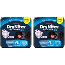 Endlich wieder ruhige Nächte für deinen Sohn! Die Huggies DryNites Pyjama-Unterhosen sind speziell für Jungs zwischen 8 und 15 Jahren entwickelt, die nachts noch mal ins Bett machen. Mit der praktischen Monatspackung mit 52 Stück bist du bestens ausgestattet. Die Unterhosen passen für Kinder mit einem Gewicht von 20-50 kg und bieten zuverlässigen Schutz durch ihr hochabsorbierendes System. Das weiche Polyester-Futter fühlt sich angenehm auf der Haut an und sorgt für maximalen Komfort die ganze Nacht über. Besonders diskret: Die Unterhosen sehen aus wie normale Slips und sind unter der Schlafkleidung kaum zu erkennen - so bewahrst du die Privatsphäre deines Kindes. Einfach anziehen und morgens entsorgen - keine lästige Wäsche mehr! Die wasserresistente Schicht hält zuverlässig dicht, während die atmungsaktive Materialkombination für ein trockenes Gefühl sorgt. Perfekt für Übernachtungen bei Freunden, Klassenfahrten oder einfach für den täglichen Gebrauch zu Hause. Gib deinem Sohn das Selbstvertrauen zurück, unbeschwert einzuschlafen - ohne Angst vor unangenehmen Überraschungen am nächsten Morgen!