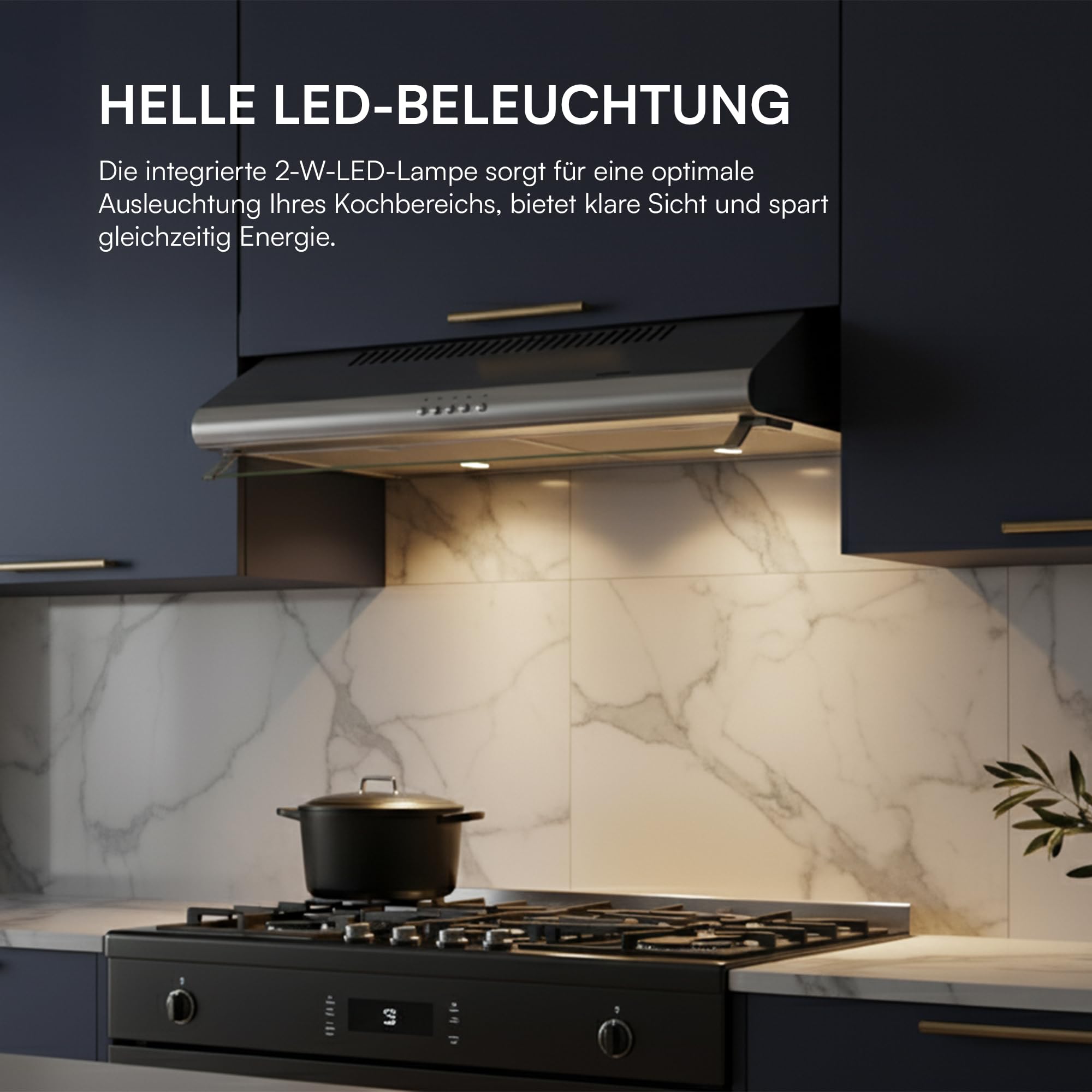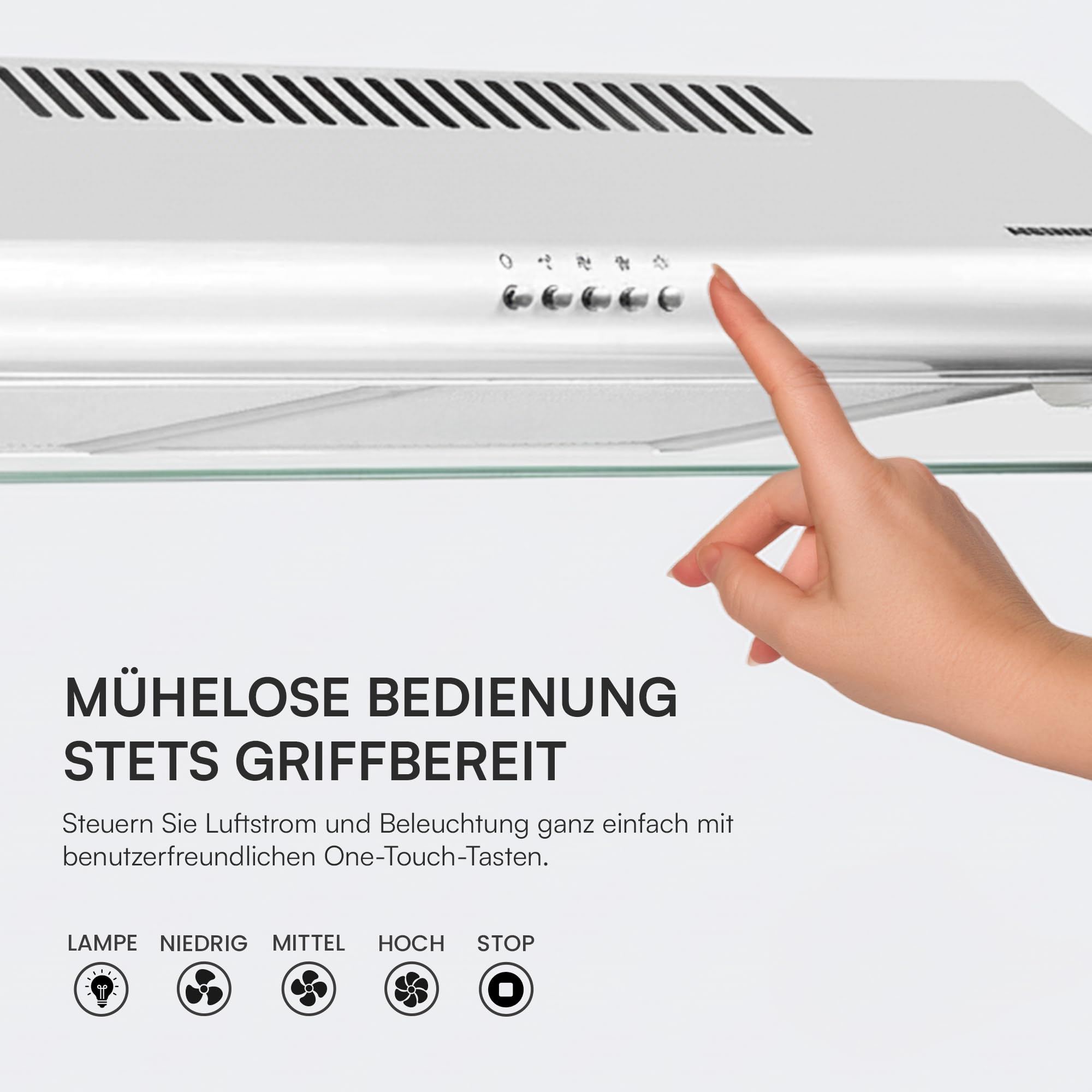 Die moderne Touch-Steuerung macht das Bedienen super einfach. Drei Leistungsstufen stehen zur Auswahl, von sanft bis Power-Absaugung. Die energiesparenden LED-Lichter sorgen dafür, dass dein Kochbereich perfekt ausgeleuchtet ist.