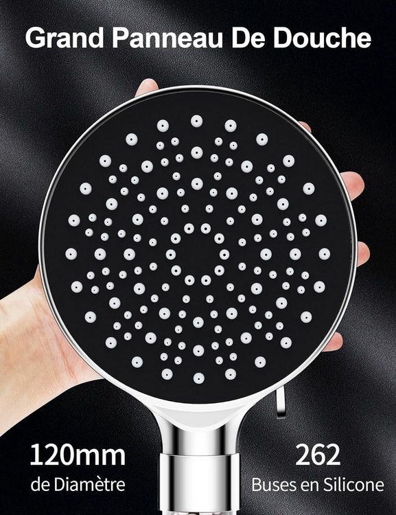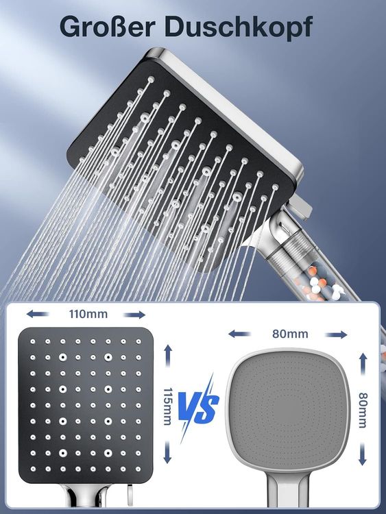 Wellness für dein Badezimmer! Dieser Diboniur Duschkopf mit 120mm großem Panel verwöhnt dich mit 6 Strahlarten: Mix, Regen, Hochdruck, Strahl, Puls und Nebel. Mit integriertem Kalkfilter und Mineralkugeln für bessere Wasserqualität. Air Boost Technologie für starken Strahl auch bei niedrigem Wasserdruck. Anti-Kalk-Silikondüsen sind leicht zu reinigen. Einfache Installation ohne Werkzeug - passt auf alle Standardschläuche. Spare Wasser ohne Komfortverlust. Genieße ein luxuriöses Dusch-Erlebnis jeden Tag!