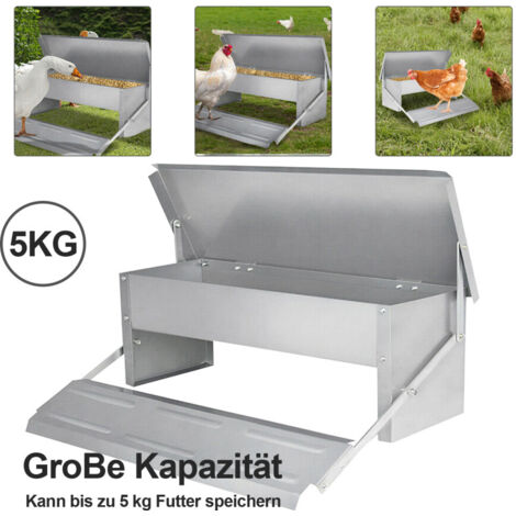 Perfekt für deine Hühner! Dieser automatische Futterspender hat 5kg Kapazität - musst du nicht ständig nachfüllen. Mit cleverem Fußpedal: Hühner über 500g treten drauf und der Deckel öffnet sich. Verzinktes Material, absolut wetterfest und korrosionsbeständig. Der Deckel hält Ratten fern und schützt vor Regen. Maße: 53x21x10 cm, 40 cm hoch. Einfach zu montieren, deine Hühner werden's lieben! Auch super für Enten, Truthähne und Gänse. Hol dir diesen praktischen Helfer für deinen Hühnerstall!