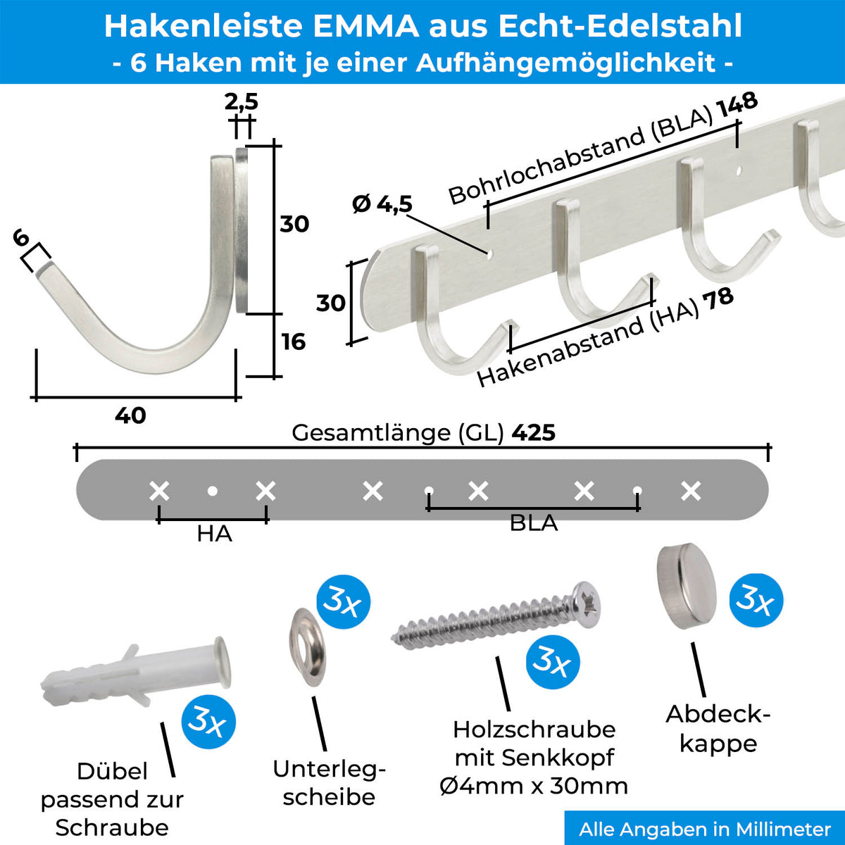 Diese ESKASI Garderobenleiste ist ein echter Hingucker! 59cm lang mit 8 stabilen Haken in edlem Gold. Aus rostfreiem Edelstahl - hält ewig, auch in feuchten Räumen wie Bad oder Küche. Jeder Haken trägt bis zu 3kg, also insgesamt 24kg - mehr als genug für Jacken, Taschen und Handtücher. Montageset inklusive - mit Fischer Dübeln geht die Installation ratzfatz. Die schicken Schraubenabdeckungen sorgen für ein perfektes Finish. Perfekt für Flur, Eingangsbereich, Bad oder Schlafzimmer. Sieht nicht nur gut aus, sondern ist auch super praktisch. Einfach aufhängen und sich über mehr Ordnung freuen!