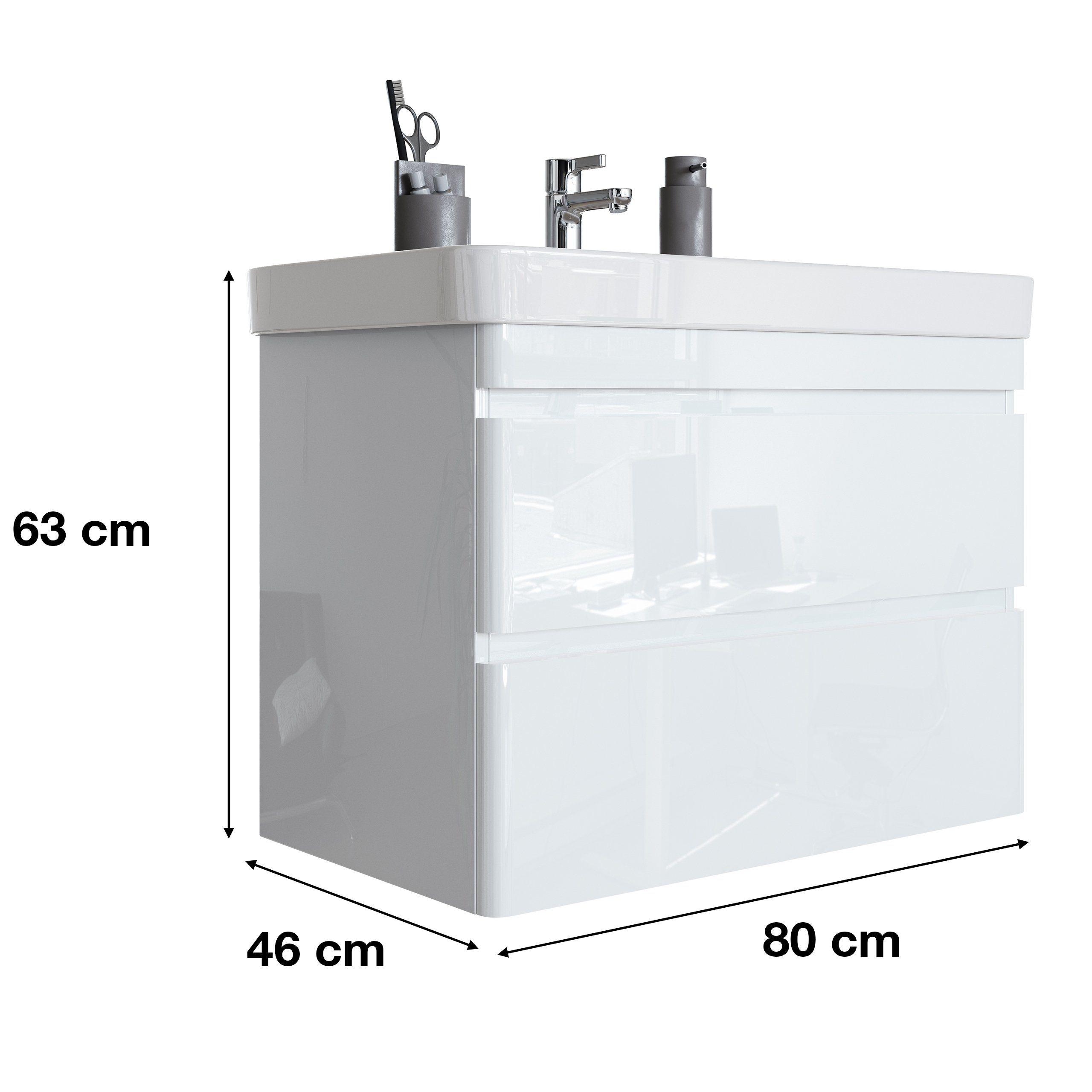 Mehr Stauraum und Stil für dein Bad! Dieser wandhängende Badezimmerschrank in Weiß (76x46x50cm) bietet mit 2 Schubladen und Regalen Platz für alle Pflegeprodukte. Das integrierte Keramik-Waschbecken ist pflegeleicht und kratzfest. Das geniale LED-Radarsensorlicht geht automatisch an wenn du reinkommst - super praktisch nachts! Aus wasserfestem MDF-Material das Feuchtigkeit standhält. Mit 32,9kg Gewicht stabil und langlebig. Einfach montieren und schon wird dein Bad zum Wohlfühl-Ort! Der 3,5cm Wasserhahn ist nicht enthalten.