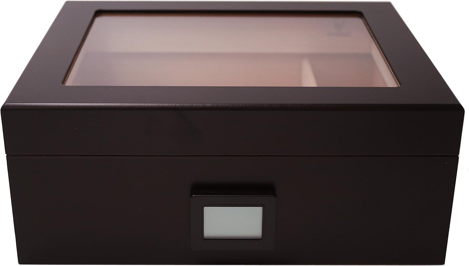 Premium Zigarren Humidor für echte Genießer! Der GERMANUS Ebenum Humidor aus spanischem Zedernholz konserviert deine Zigarren perfekt. Mit digitalem Hygrometer und GERMANUS Kristall-Befeuchter für die ideale Luftfeuchtigkeit. Kapazität für ca. 50 Zigarren (Corona-Größe). Maße: 26,8x22,3x10,6cm außen - kompakt aber geräumig. Inklusive detaillierter Anleitung mit Fotos und Videos - perfekt für Einsteiger! Mit 2 Schlüsseln, Trennwand und 2 Befeuchter-Boxen. Das elegante Ebenholz-Design mit Sichtfenster sieht einfach klasse aus! Deine Zigarren bleiben frisch und aromatisch - so macht Lagern Spaß!