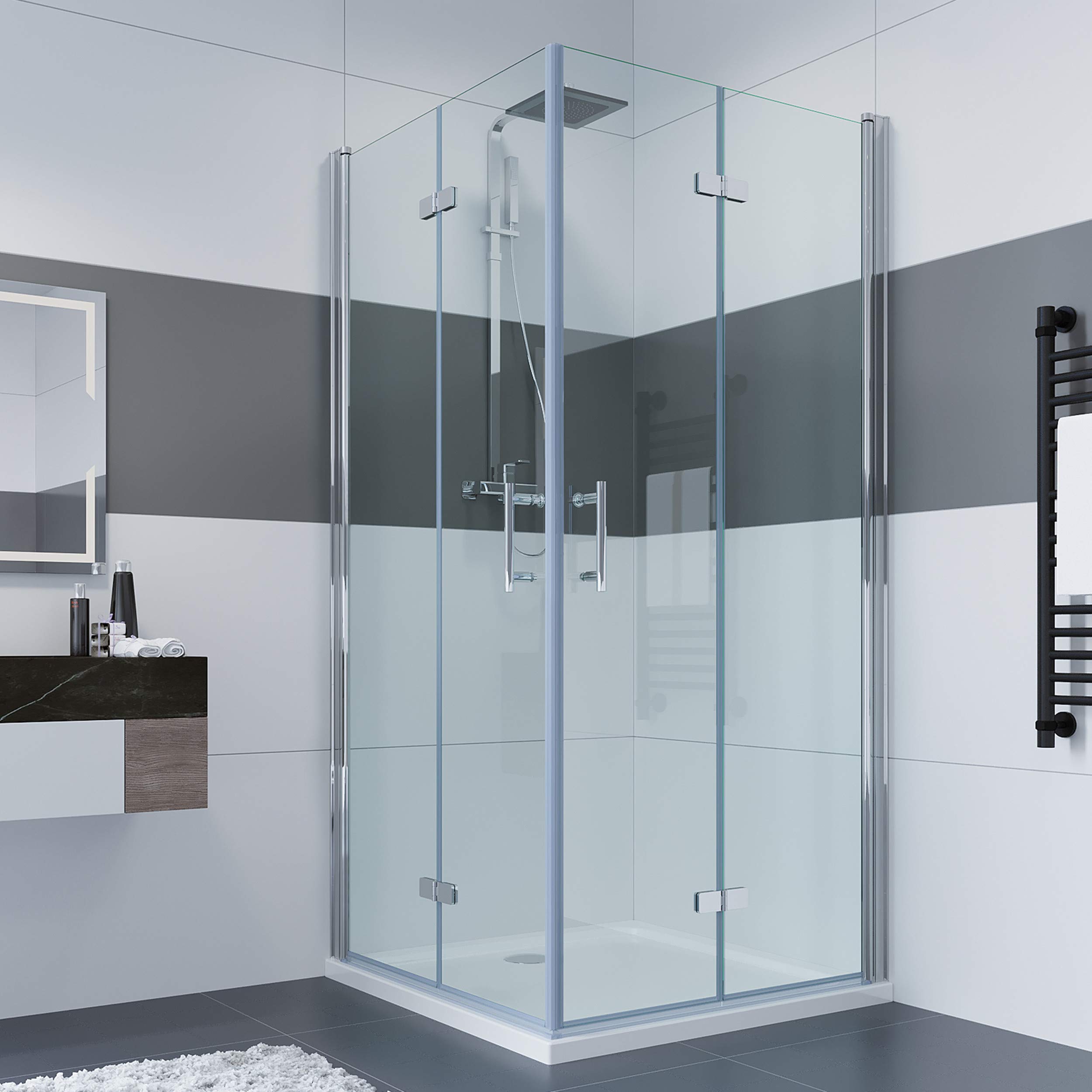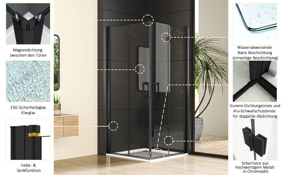 Endlich mehr Komfort im Bad! Diese Duschkabine mit cleverer Falttür ist perfekt wenn der Platz mal nicht so üppig ist. Maße: 75x100x195cm (Höhe) - also ideal für normale Badezimmer. Das Besondere: Die Tür lässt sich komplett zusammenfalten und platzsparend an die Wand klappen! Aus 6mm ESG Sicherheitsglas - mega stabil und sicher, besonders mit Kindern. Mit beidseitiger Nano-Beschichtung - das heißt weniger Putzen, weil Wasser und Kalk einfach abperlen. Der magnetische Türverschluss sorgt für perfekte Dichtung - keine Wasserspritzer mehr auf dem Badezimmerboden! Mit Hebe-Senk-Mechanismus - die Tür hebt sich beim Öffnen leicht an und gleitet super leicht. Montage links oder rechts möglich - ganz wie du willst. Lieferung inklusive Montagezubehör und Anleitung. Achtung: Duschwanne nicht im Lieferumfang! CE-zertifiziert nach EN14428 - alles safe also. Einfach klasse für moderne Bäder!