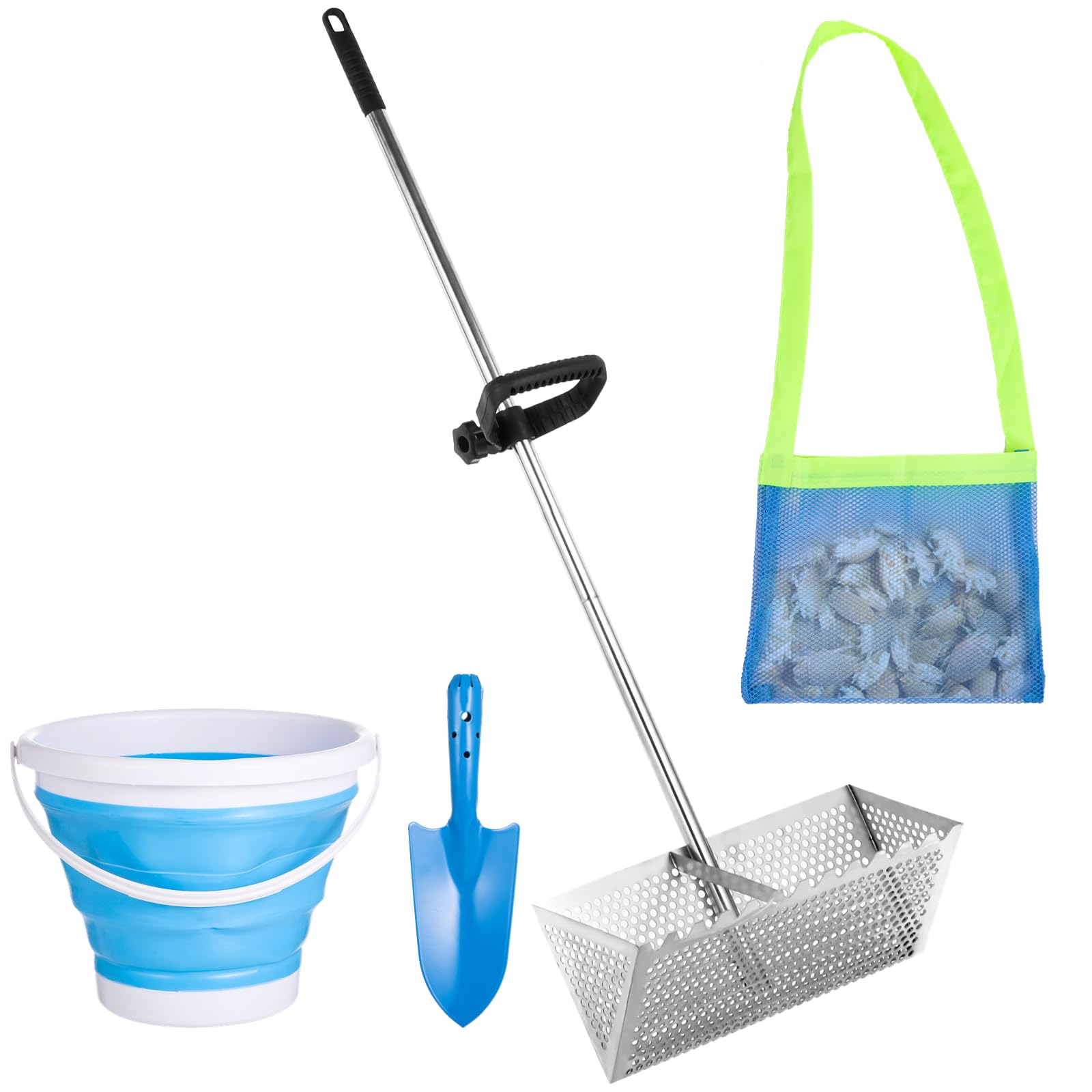 Perfektes Strandwerkzeug für Schatzsucher! Dieses komplette Sandflohrechen-Set aus robustem 304 Edelstahl rostet nicht und hält auch Salzwasser stand. Mit dem 152 cm langen abnehmbaren Griff (dreiteilig) musst du dich nicht bücken und kannst bequem im Stehen arbeiten. Der 40,6 cm breite Korb mit scharfen Zähnen gräbt tief und findet garantiert alle Sandflöhe und Muscheln. Im Set enthalten: Sandflohrechen, Sandsieb, schwarze Strandschaufel, Klauenrechen mit Netz und ein 5-Liter-Eimer. Der ergonomische D-Griff liegt super in der Hand. Montage in nur 10 Minuten - einfach die Teile zusammensetzen und schon kann die Schatzsuche beginnen! Nach dem Gebrauch einfach mit Wasser abspülen und abtrocknen, dann hält das Set viele Jahre. Ob für Angeln, Muschelsammeln oder einfach nur zum Spielen am Strand - dieses Set macht Strandtage zum Abenteuer!