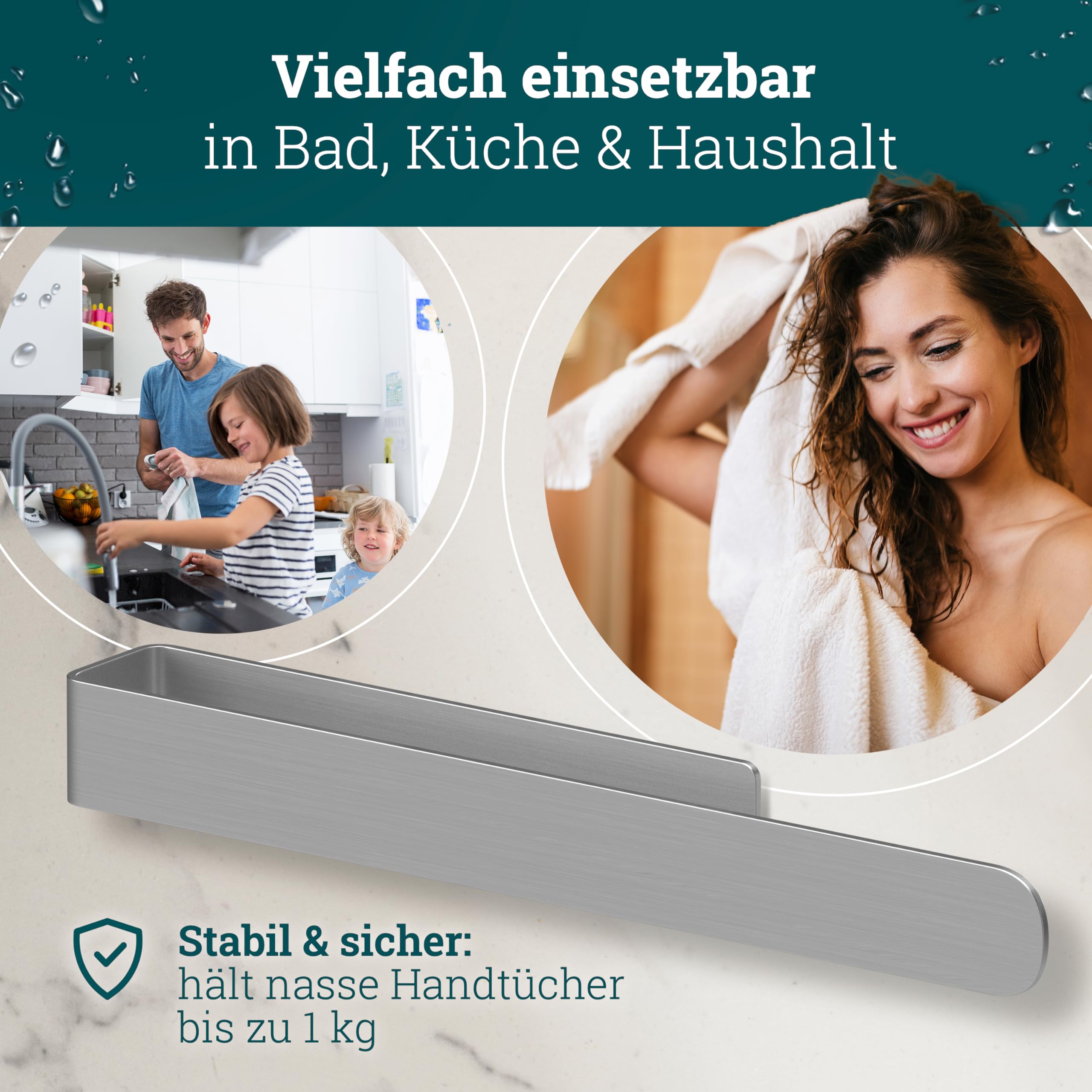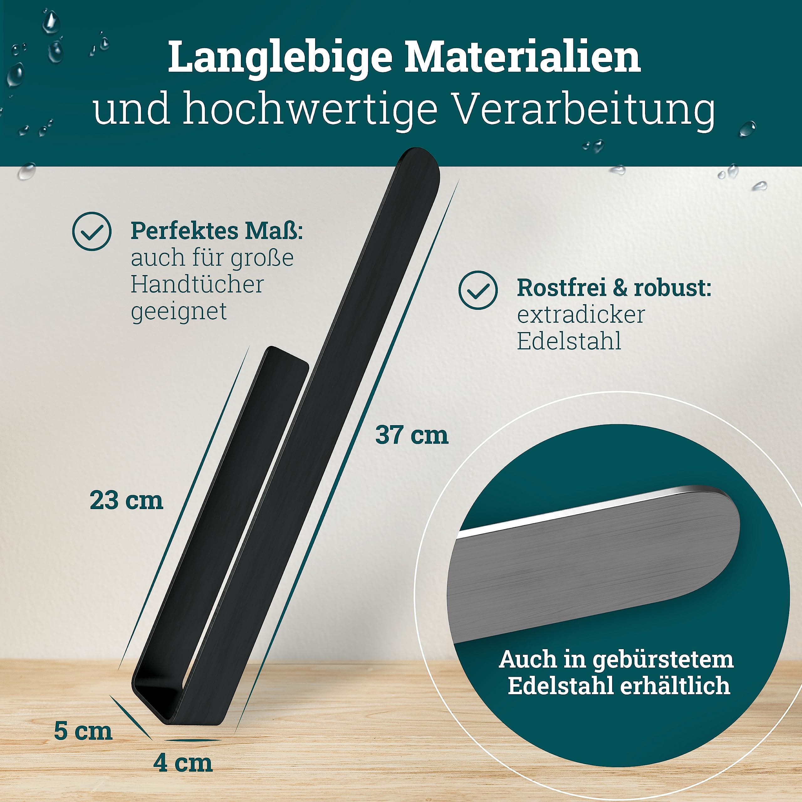 Keine Lust auf Bohrlöcher in den Fliesen? Dieser husman Handtuchhalter klebt einfach fest - ganz ohne Bohren! Aus extra-dickem Edelstahl S304, rostfrei und super langlebig. Mit 37cm Länge perfekt für große Handtücher. Die Kombination aus 3M Klebeband und Spezialkleber hält bombenfest - selbst nasse Handtücher bis 1kg sind kein Problem. Einfach die Schutzfolie abziehen, auf eine glatte, saubere Oberfläche drücken und fertig! Perfekt für Fliesen, Glas, Spiegel oder Möbel. Ob im Bad für Handtücher, in der Küche für Geschirrtücher oder wo immer du praktischen Stauraum brauchst. Zeitloses Design in gebürstetem Edelstahl passt zu jedem Einrichtungsstil. Made in Germany Qualität - wenn du nicht zufrieden bist, gibt's Geld zurück. Endlich Ordnung im Bad ohne handwerkliches Geschick!