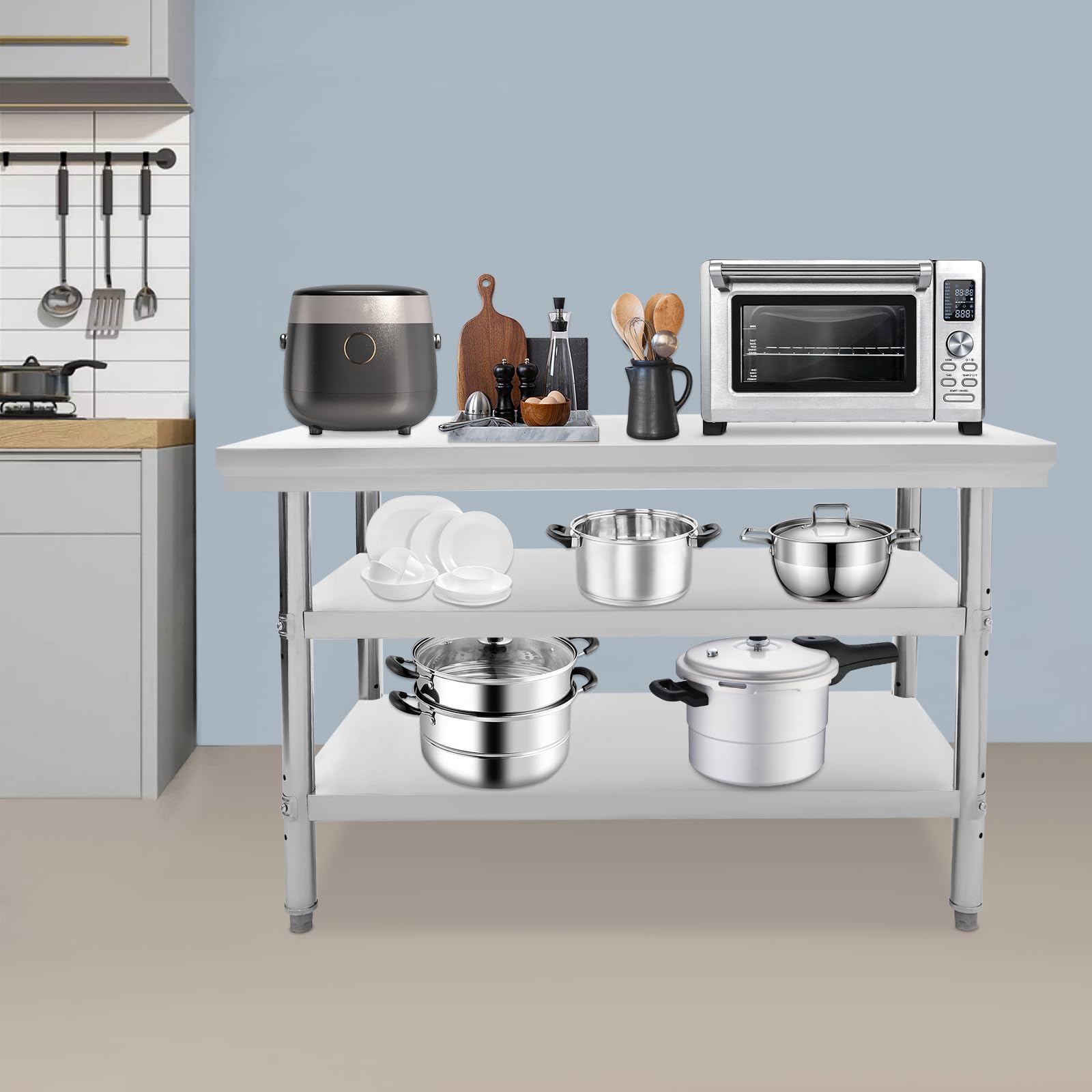 Robuster Arbeitstisch aus 201 Edelstahl für Küche, Garage oder Garten! Maße: 120x60x90 cm mit drei praktischen Ebenen für optimalen Stauraum. Hält bis zu 100 kg Gesamtlast aus - stabil genug für schwere Küchengeräte und Vorräte. Die verstellbaren Füße (2 cm Spielraum) gleichen unebene Böden aus. Besonderheiten: Dreieckige Verstärkungsstruktur für extra Stabilität und Innensechskantschrauben die nicht so schnell verschleißen. Perfekt für Großküchen, Restaurants, aber auch für den Hausgebrauch. Einfach zusammenzubauen - allerdings brauchst du einen Sechskantschlüssel für die Höheneinstellung. Die gebürstete Oberfläche ist korrosionsbeständig und leicht zu reinigen. Mit 25 kg Gewicht steht der Tisch bombenfest. Ideal um Mehl, Zucker, Kochutensilien oder Werkzeuge ordentlich zu verstauen. Ein echter Allrounder für Profis und Hobbyköche!