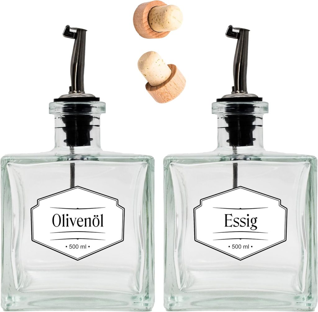 Perfekt für deine Küche! Diese 4 Glasflaschen bringen nicht nur Ordnung in deine Öle und Essige, sondern sehen auch noch super stylisch aus. Mit 700ml Fassungsvermögen und dem genialen Edelstahl-Ausgießer hast du immer die perfekte Kontrolle über die Menge - kein Verschütten mehr!