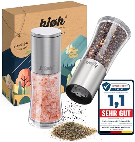 Mmmmh, frisch gemahlene Gewürze! Dieses Salz- und Pfeffermühlen Set bringt den vollen Geschmack auf deinen Teller. Aus edlem Edelstahl und robustem Glas sehen sie nicht nur super aus, sondern sind auch praktisch. Das Keramik-Mahlwerk ist der Star - es mahlt gleichmäßig und bleibt lange scharf. Und du kannst den Mahlgrad stufenlos einstellen: Fein für Suppen, grob für Steaks - ganz wie du willst. Mit 160 ml Fassungsvermögen musst du nicht ständig nachfüllen, und die 13,2 cm Höhe passen in jedes Küchenregal. Einfach drehen und das aromatische Gewürzaroma genießen. Ob für dich selbst oder als Geschenk - diese Mühlen machen jede Mahlzeit zum Erlebnis. Einfach befüllen, mahlen und schmecken lassen!
