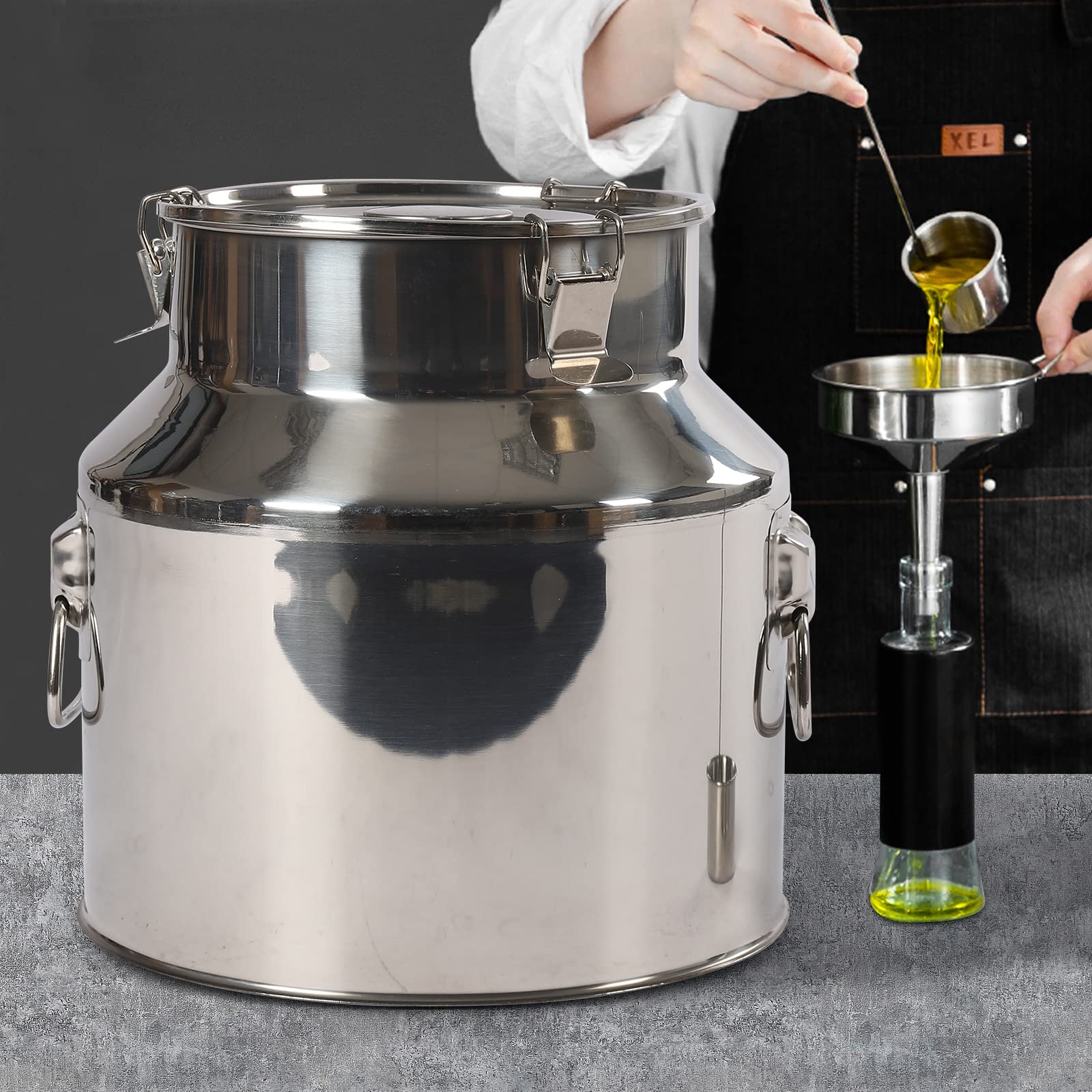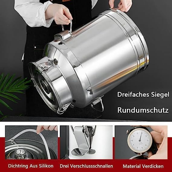 Diese robuste Edelstahl-Milchkanne ist ein echter Alleskönner! Ob für Milch, Wein, Öl oder Saft - der Behälter aus 201 Edelstahl ist korrosionsbeständig, rostfrei und hält auch höheren Temperaturen stand. Mit dem speziellen Silikondichtring und der dreifachen Verriegelung ist die Kanne absolut auslaufsicher - perfekt für unterwegs oder zur Aufbewahrung in der Küche. Die beiden seitlichen Griffe machen das Tragen super bequem, egal ob du die 5 Liter oder 7 Liter Variante wählst. Der Deckel sitzt bombenfest und verhindert lästiges Verschütten. Übrigens - die Kanne ist nicht nur praktisch, sondern sieht auch noch richtig stylisch aus mit ihrem silbernen Finish. Perfekt für den Haushalt, aber auch für gewerbliche Zwecke ideal. Einfach reinigen und immer wieder verwenden - so macht Aufbewahren und Transportieren richtig Spaß!