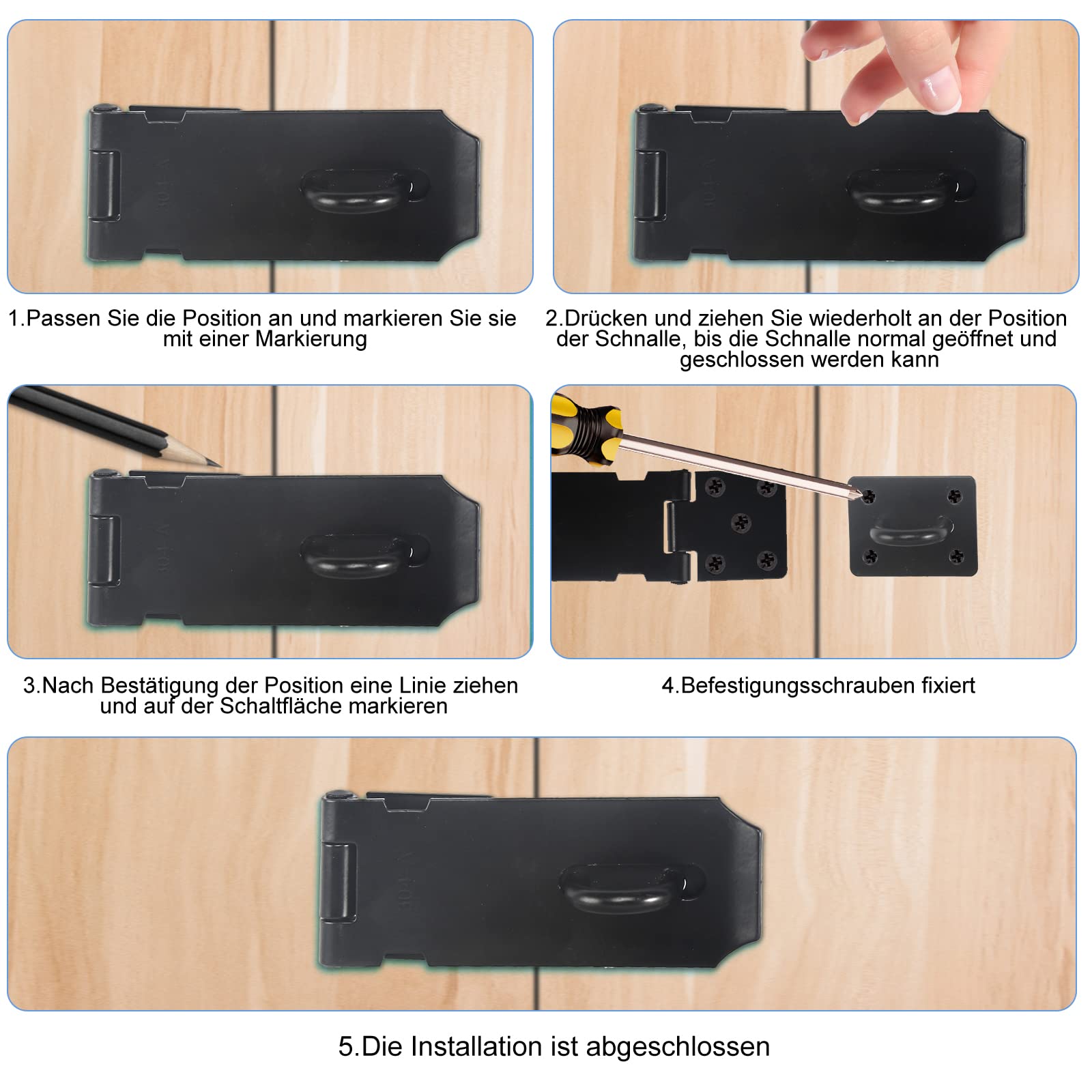 Dieses Schloss-Set von ComPDCVD bringt Sicherheit für deine Türen! Enthält 2 Vorhängeschlösser und 2 Haspen aus robustem 304 Edelstahl. 4 Zoll Größe, schwarze Beschichtung. Mit 18 Schrauben und Schraubendreher für einfache Montage. Das Vorhängeschloss hat wasserdichte Kunststoffummantelung und 4-Stift-Zylinder für extra Sicherheit. Passt für Holztüren, Gartentore, Schuppen, Garagen, Spinde und mehr. 180-Grad und 90-Grad Montage möglich. Stabil, rostfrei und langlebig. Einfach installieren und deine Sachen sind sicher verwahrt! Komplett-Set mit 6 Schlüsseln - alles dabei was du brauchst.