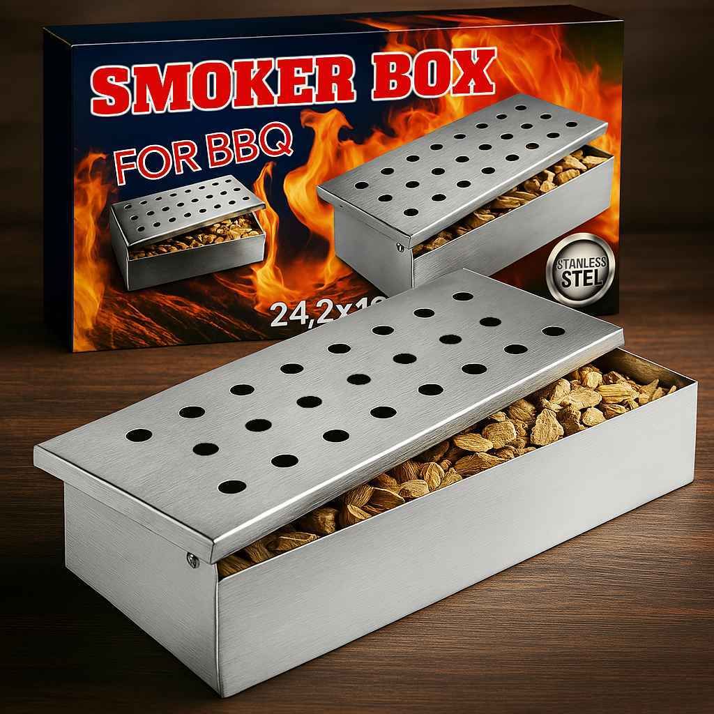 Bring Raucharoma auf deinen Grill! Diese Edelstahl-Räucherbox in V-Form macht aus jedem Grill einen Smoker! Mit 25x7x4,8cm perfekt für Holzkohle- und Gasgrills! Einfacher Deckel zum Nachfüllen der Holzspäne! Aus hochwertigem Edelstahl - rostfrei und hitzebeständig! V-Form für einfache Platzierung auf dem Grillrost! Kein Werkzeug nötig - einfach drauflegen und losräuchern! Verleiht deinem Fleisch intensives Raucharoma! Perfekt für Steaks, Fisch oder Gemüse! Damit wirst du zum Grill-Profi!