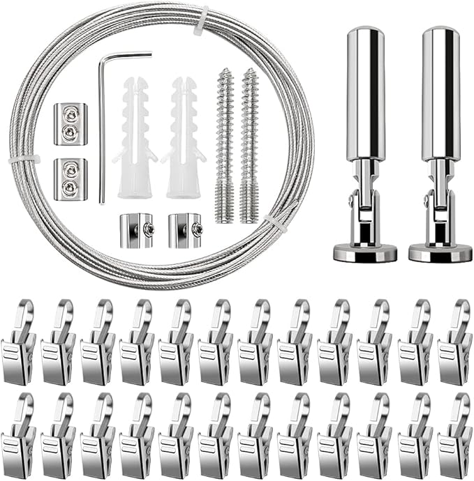 Du hast keine Lust auf komplizierte Gardinenstangen oder rostige Haken? Dann ist dieses Set genau das Richtige für dich! Mit der Edelstahl-Vorhangschnur aus robustem 304er Material machst du Schluss mit Gefummel – die Teile sind korrosionsbeständig und halten ewig. Das Beste: Die Schnur lässt sich um 180 Grad drehen! Ob im Bad, am Fenster oder in der Garage – du kannst sie überall anbringen und ganz easy deine Vorhänge, Wäsche oder sogar Werkzeuge aufhängen. Im Lieferumfang findest du alles, was du brauchst: 5 m Seil, 2 Sockel, 30 Haken, Schrauben und sogar einen kleinen Schraubenschlüssel. Montage? Kein Problem! Einfach die Basis an der Wand festmachen, das Seil durchfädeln und mit den Nieten fixieren – schon hast du deine persönliche Aufhänge-Lösung. Perfekt fürs Badezimmer, um Duschvorhänge und Badekugeln zu organisieren, oder in der Garage, um Werkzeug ordentlich zu verstauen. Auch als Foto-Draht im Café oder für Wäscheleinen super praktisch. Total platzsparend und vielseitig – probier's aus!