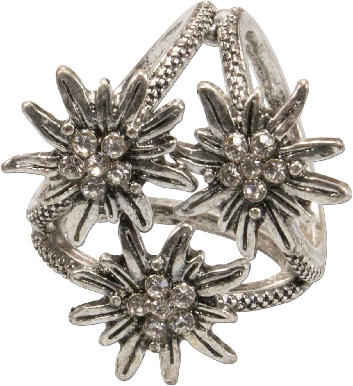 Wunderschöne Blusenbrosche von Alpenflüstern - perfekt für Tracht und festliche Anlässe! 🌸\n\nDas elegante Design mit 3 funkelnden Strass-Edelweissen und 2 kleinen Herzchen ist ein absoluter Hingucker. Mit ca. 6x1,5cm passt sie perfekt zu hochgeschlossenen Blusen, Dirndl oder Jacketts.\n\nIm antik-silbernen Look wirkt sie traditionell und modern zugleich. Der sichere Broschen-Verschluss hält zuverlässig, ohne die Stoffe zu beschädigen.\n\nAlpenflüstern verbindet seit Jahren bayerische Tradition mit modernem Design. Jedes Stück wird mit Liebe zum Detail im familiengeführten Betrieb am Starnberger See gefertigt.\n\nPerfekt für:\n• Volksfeste und Oktoberfest\n• Hochzeiten und Taufen\n• Weihnachtsmärkte\n• Alle festlichen Anlässe\n\nVerleihe deinem Outfit den letzten Schliff mit diesem bezaubernden Accessoire. Ob zu Tracht oder eleganter Bluse - diese Brosche macht jede Frau zum Star!\n\nEin wunderbares Geschenk für alle, die bayerische Tradition lieben oder ein besonderes Andenken an ihren Bayern-Besuch suchen.