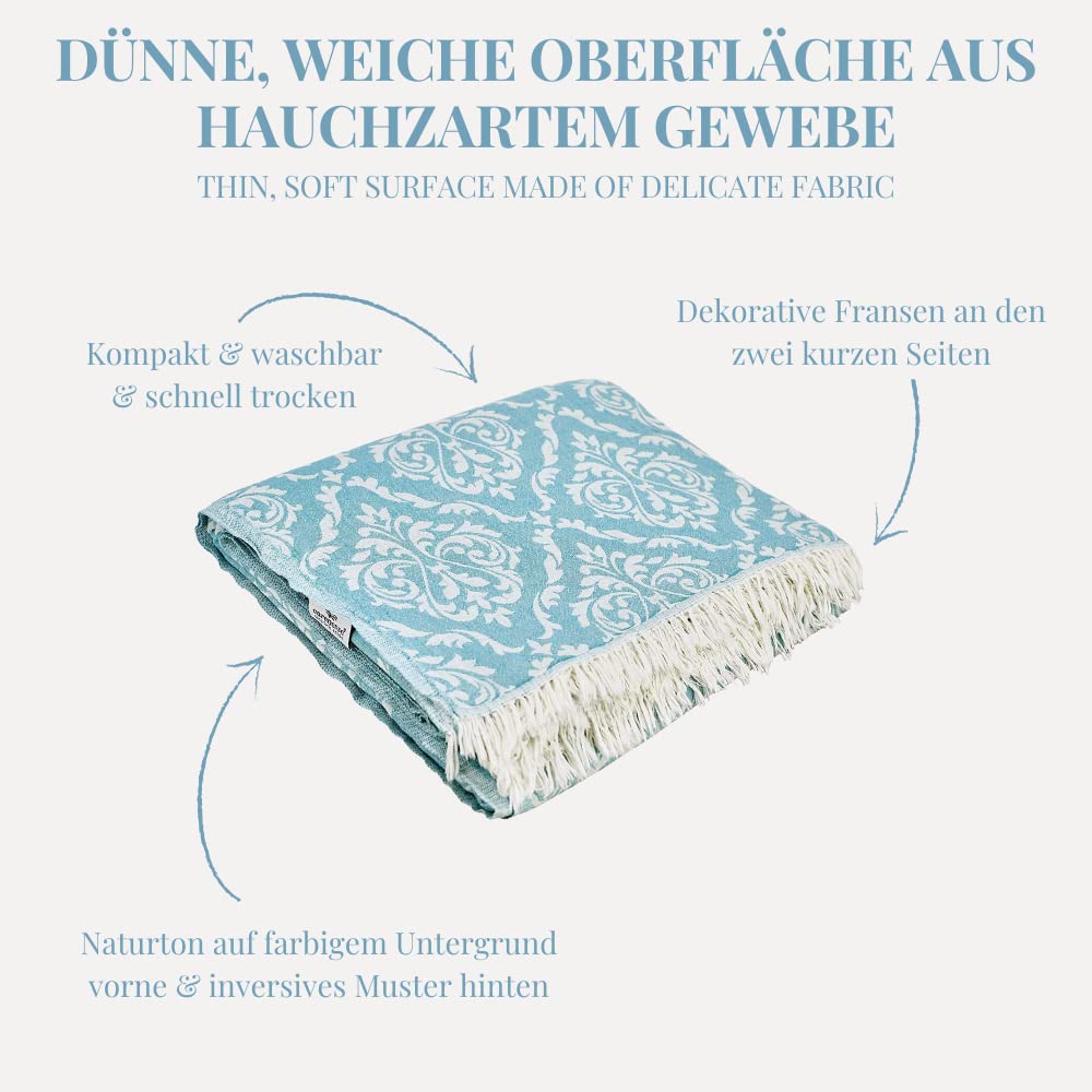 Elegante Wohndeko die begeistert! Die Carenesse Jacquard Tagesdecke in Petrol überzeugt durch ihr wunderschönes barockes Muster, das beidseitig unterschiedlich erscheint - vorne in Naturton, hinten in Petrol. So hast du immer die Wahl und kannst je nach Stimmung wechseln. Hergestellt aus 100% schadstoffgeprüfter Baumwolle, ist die Decke besonders hautfreundlich und anschmiegsam. Das feine Gewebe gibt ihr eine glatte, weiche Oberfläche, die sich super angenehm anfühlt. Perfekt als Überwurf für Bett oder Sofa, aber auch als Picknickdecke oder stylische Tischdecke einsetzbar. Praktisch: Die Decke ist waschbar, vorgewaschen und läuft daher nicht ein. Mit den Maßen 150x200 cm passt sie ideal auf Single-Betten und ist auch als Sofadecke ein echter Hingucker. Die feinen Fransen an den Runden geben dem Ganzen den letzten Schliff. Maße: 150x200 cm • Material: 100% Baumwolle • Design: Doppelseitiges Jacquard-Muster • Farbe: Petrol/Naturton • Besonderheiten: Waschbar, vorgewaschen, garngefärbt • Vielseitig einsetzbar: Als Bettüberwurf, Sofadecke, Picknickdecke oder Tischdecke