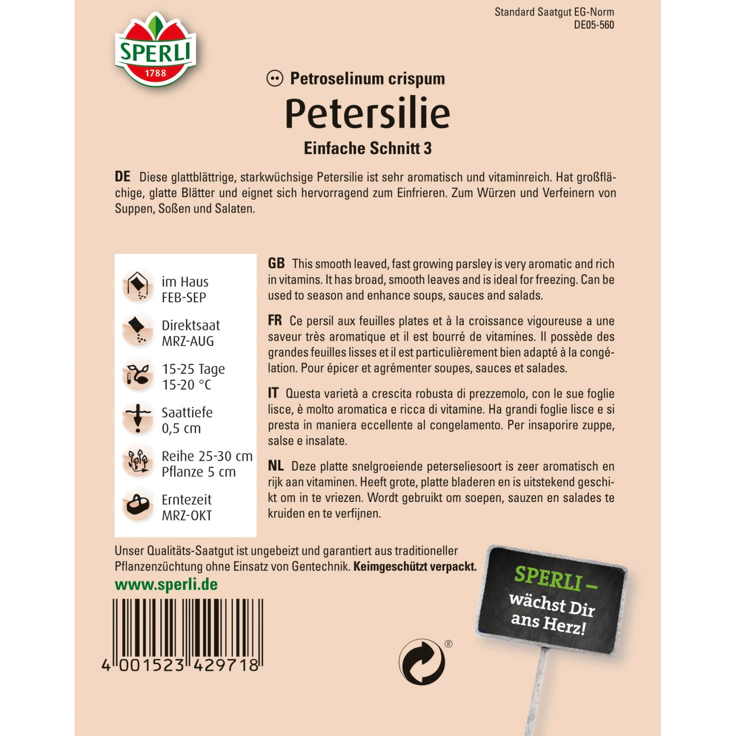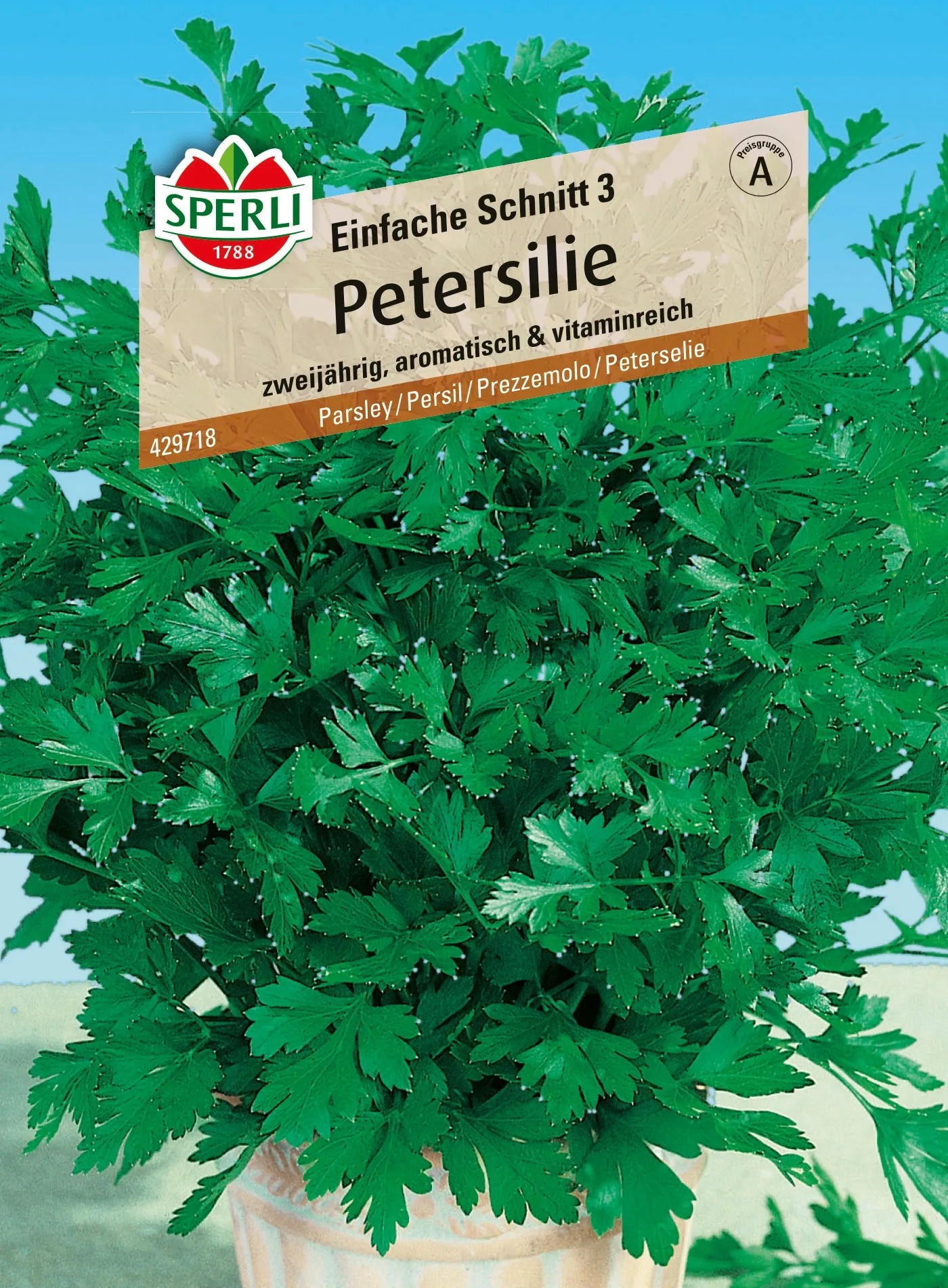 Frische Petersilie aus dem eigenen Garten - lecker! Diese Sperli Sorte 'Einfache Schnitt 3' ist eine glattblättrige, super aromatische Petersilie. Perfekt für Soßen, Kartoffelgerichte, Salate oder einfach als Deko. Die zweijährige Pflanze kannst du von März bis August aussäen - Saattiefe nur 0,5-1cm! Sie keimt bei 18-22°C innerhalb von 14-28 Tagen. Pflanzabstand: 30cm, Wuchshöhe: 20-30cm. Von Mai bis Dezember kannst du immer frisch ernten! Standort: Sonne bis Halbschatten in lockeren, humosen Böden. Übrigens: Petersilie ist nicht nur lecker, sondern auch gesund - in der Naturheilkunde wird sie bei Blähungen oder zur Entwässerung verwendet. Du kannst sie nicht nur im Garten, sondern auch in Töpfen auf Balkon oder Fensterbank anbauen. So hast du immer frisches Grün zur Hand! Einfach aussäen, pflegen und sich über die eigene Ernte freuen. Bon appétit!