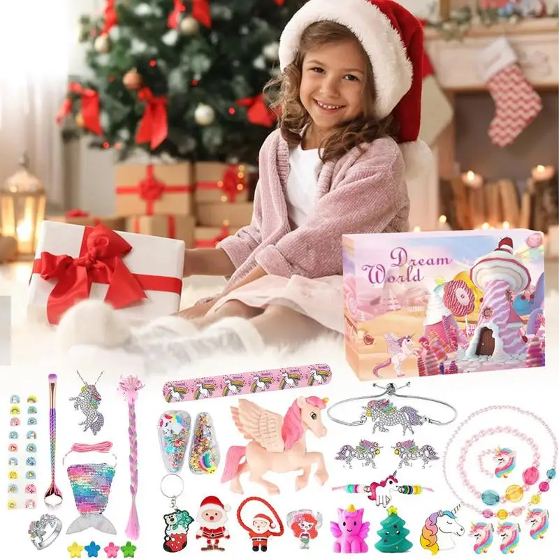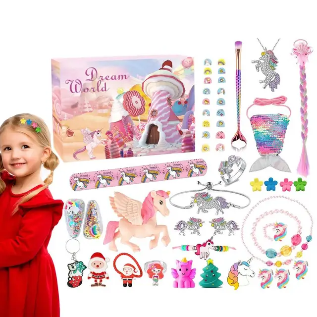 Weihnachtszauber für kleine Prinzessinnen! 🦄✨ Dieser Einhorn-Adventskalender macht die Wartezeit auf Weihnachten zum reinsten Vergnügen.\n\n24 nummerierte Schachteln mit zauberhaften Überraschungen:\n• Schmuck: Halsketten, Armbänder, Ringe\n• Haaraccessoires: Spangen, Gummis\n• Spielzeuge: Spiegel, Kämme, Aufkleber\n• Kinder-Make-up und Pinsel\n\nAlles im magischen Einhorn-Design mit Regenbogen, Blumen und Wolken. Die leuchtenden Farben begeistern jedes Mädchen.\n\nAus sicheren, umweltfreundlichen Materialien - ohne scharfe Kanten, geruchsneutral. Jedes Teil einzeln verpackt.\n\nPerfektes Geschenk für:\n• Töchter und Enkelinnen\n• Nichten und kleine Schwestern\n• Kindergeburtstage im Dezember\n\nMach deinem Mädchen eine Freude und lass die Weihnachtszeit magisch werden! 🎄