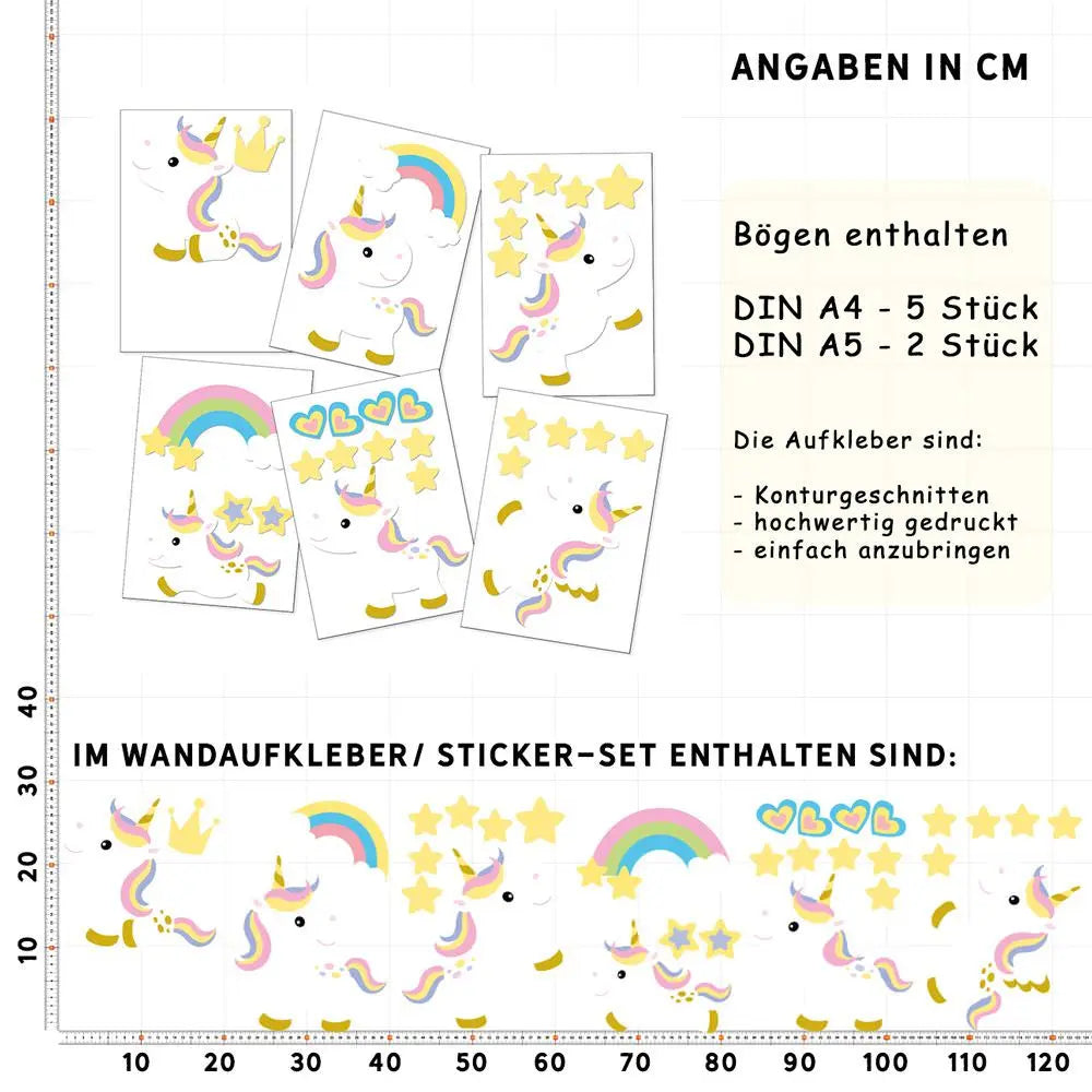 Verwandelt jedes Zimmer in eine märchenhafte Welt! Dieses Einhorn-Design begeistert kleine Prinzessinnen und schafft eine gemütliche Atmosphäre zum Träumen und Spielen. Einfach anbringen und die strahlenden Kinderaugen genießen!