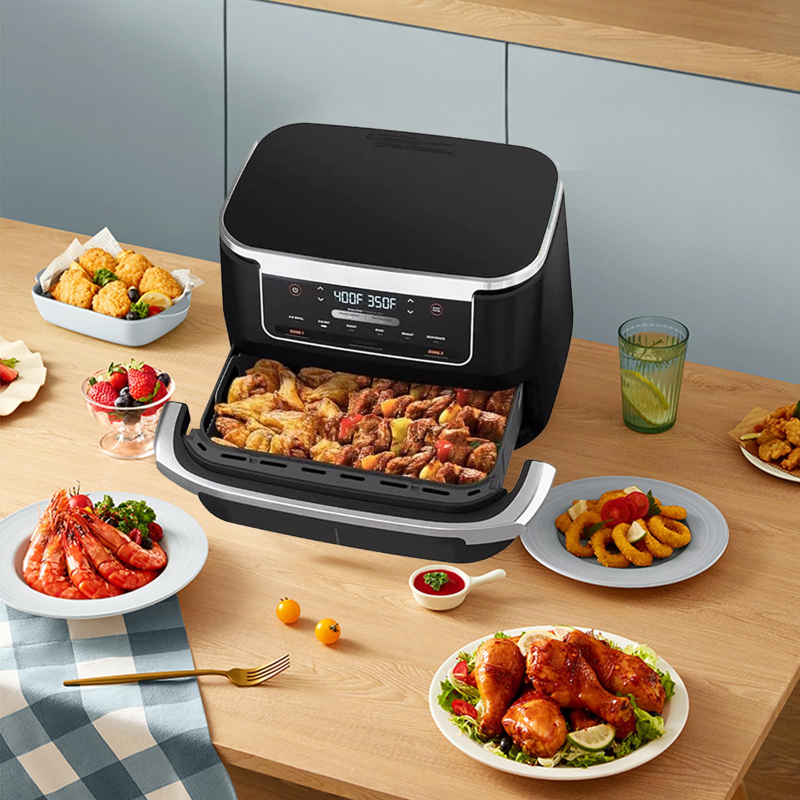 Willst du das Maximum aus deiner Ninja Foodi FlexDrawer AF500EU herausholen? Dieses komplette Zubehör-Set macht's möglich! Enthalten sind: 1 großer 10,4L Silikoneinsatz, 2 kleinere 5,2L Einsätze, ein Grillrost, ein Spießgestell mit 4 Spießen, ein Silikonpinsel, eine Grillzange und 2 hitzebeständige Handschuhe - alles, was du für abwechslungsreiches Kochen brauchst! Die Silikoneinsätze passen millimetergenau in deine Heißluftfritteuse und verhindern lästige Fettspritzer. Das beste: Du kannst zwei verschiedene Gerichte gleichzeitig zubereiten - etwa Pommes in einem Fach und Hähnchen im anderen, ohne dass sich die Aromen vermischen. Alles ist aus lebensmittelechtem, BPA-freiem Silikon und hält Temperaturen bis zu 240°C stand. Die Reinigung ist ein Kinderspiel - einfach in die Spülmaschine oder mit warmem Wasser abspülen. Egal ob knusprige Pommes, saftige Steaks, gegrilltes Gemüse oder leckere Spieße - mit diesem Set wird deine Ninja Fritteuse zur All-in-One-Küchenstation. Perfekt für Familien oder wenn du mal Gäste bewirten willst. Einfach einsetzen, loslegen und staunen, was alles möglich ist!