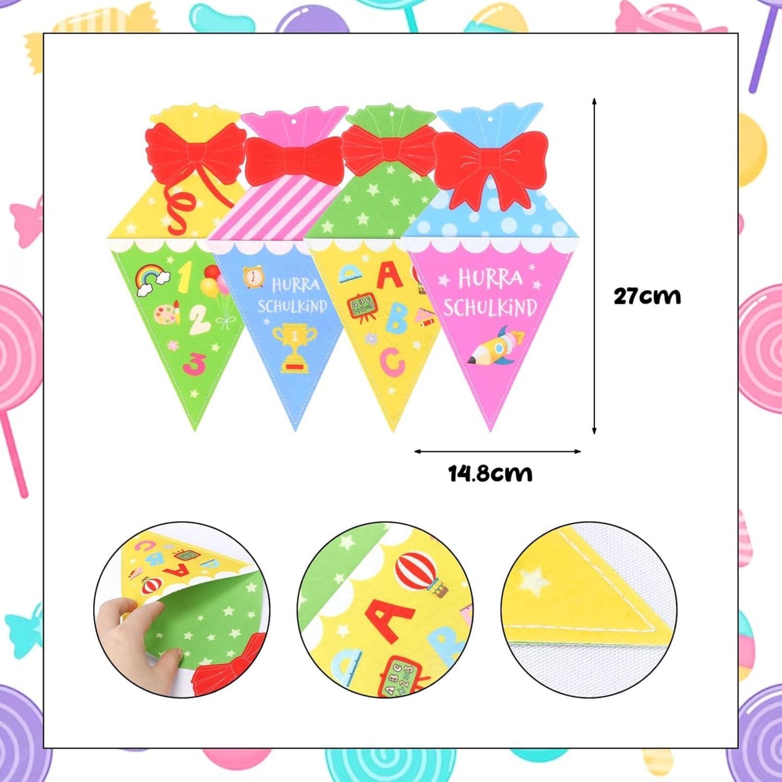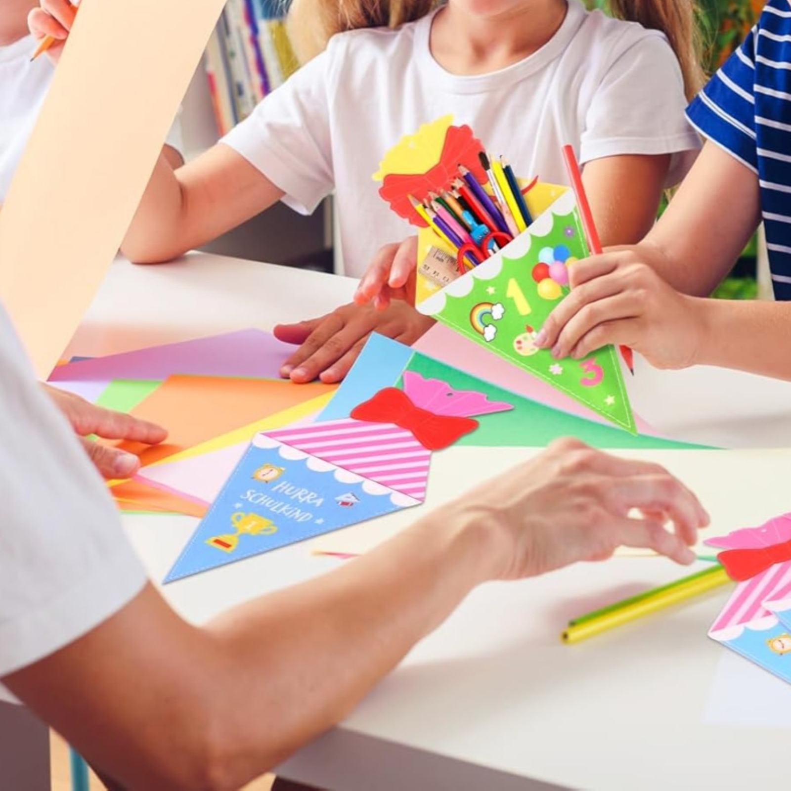Zur Einschulung etwas Besonderes basteln! Mit diesem 20-teiligen BOOMTOP Bastelset kreierst du wunderschöne Fensterbilder für den großen Tag. Enthalten sind 20 schwarze Schablonen, 15 transparente Klebeblätter, 32 bunte Papiere in 8 Farben und eine Schere. Die Motive - Bleistifte, Luftballons, Zuckertüten, ABC und Zahlen - sind perfekt für Schulanfänger. Einfach die farbigen Papiere hinter die Schablonen kleben und an Fenster, Spiegel oder Türen anbringen. Hinterlässt keine Rückstände und ist wiederverwendbar. Super für Kinder, um kreativ zu werden und die Feinmotorik zu üben. Gemeinsam basteln macht Spaß und fördert die Eltern-Kind-Beziehung. Die Fensterbilder werfen im Sonnenlicht einen bezaubernden Buntglaseffekt. Ideal für Zuhause, Kindergarten oder Schulfeier. Ein unvergessliches Bastelerlebnis zur Einschulung!