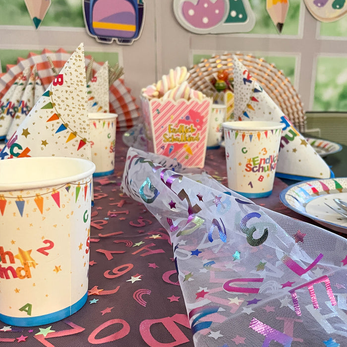 Mach die Einschulung deines Kindes unvergesslich! Dieser 5m lange Tischläufer mit süßem ABC Regenbogen-Design ist perfekt für die Einschulungsparty. Aus hochwertigem Polyester - leicht, strapazierfähig und einfach zu schneiden. Breite: 28cm - passt perfekt auf jeden Tisch. Die bunten Farben und Buchstaben machen sofort Schulanfangs-Stimmung. Kanten sind nicht genäht - sieht schlicht und elegant aus. Einfach zuschneiden auf die gewünschte Länge - Reste für nächstes Jahr aufbewahren. Leicht zu reinigen - einfach von Hand waschen und aufhängen. Vielseitig verwendbar - nicht nur als Tischdeko, sondern auch für Geschenkverpackungen, Bonbontüten oder Raumdekoration. Schafft eine tolle Atmosphäre und die Kinder lieben die bunten Farben. Auch für Lehrer geeignet um das Klassenzimmer zu dekorieren. Mach den ersten Schultag zu einem besonderen Erlebnis!