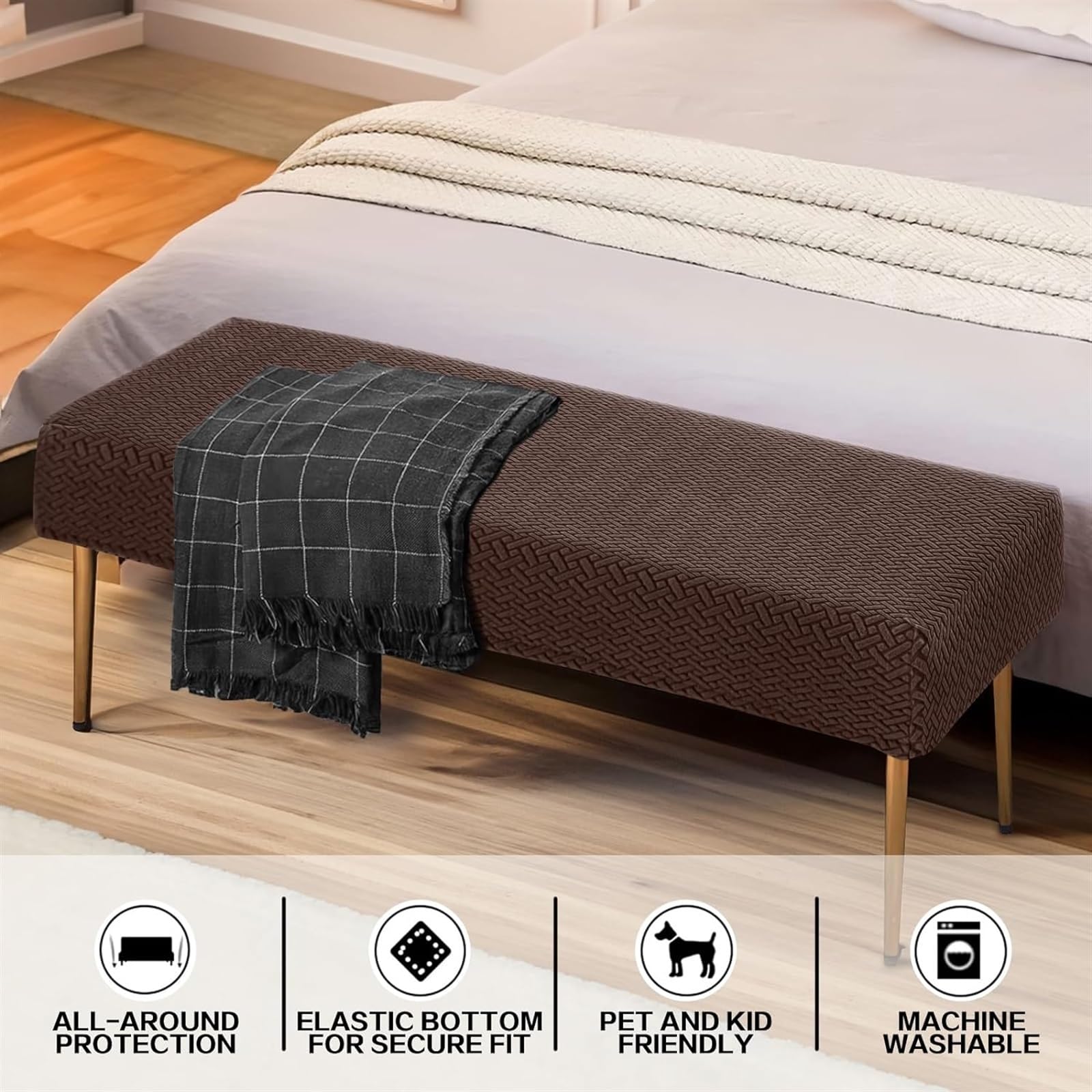 Die elegante Farbe und Textur machen deine Bank zum echten Hingucker im Wohnzimmer, Esszimmer oder Schlafzimmer. Der Bezug ergänzt verschiedene Einrichtungsstile und sorgt für ein gemütliches Ambiente.