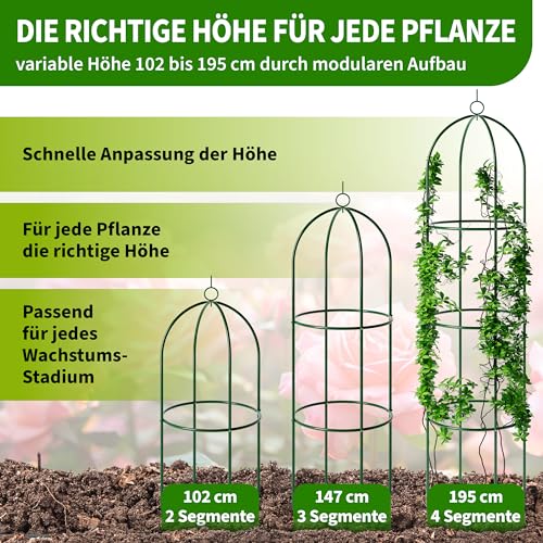 Suchst du eine stylische Rankhilfe für deine Pflanzen? Dieser Metall-Obelisk ist genau das Richtige! Er sieht nicht nur super aus, sondern gibt deinen Kletterpflanzen auch den perfekten Halt.\\n\\nOb Rosen, Clematis, Jasmin oder sogar Tomaten und Gurken - an diesem Rankgitter finden alle Kletterpflanzen Platz. Das europäische Retro-Design macht sich super im Garten, auf dem Balkon oder der Terrasse.\\n\\nEs gibt verschiedene Größen: 60cm, 90cm, 120cm, 150cm oder 180cm hoch. Der Durchmesser beträgt 28cm. Das Stecksystem ist genial - einfach zusammensetzen, keine Schrauben nötig!\\n\\nDas Metall ist mit einer dicken Kunststoffschicht überzogen, rostet also nicht. Super stabil und langlebig! Wenn du den Obelisken mal nicht brauchst, kannst du ihn einfach auseinandernehmen und platzsparend verstauen.\\n\\nDeine Pflanzen werden es dir danken - sie ranken sich empor und dein Garten bekommt eine ganz neue Dimension. Sieht aus wie ein Kunstwerk und ist dabei mega praktisch!