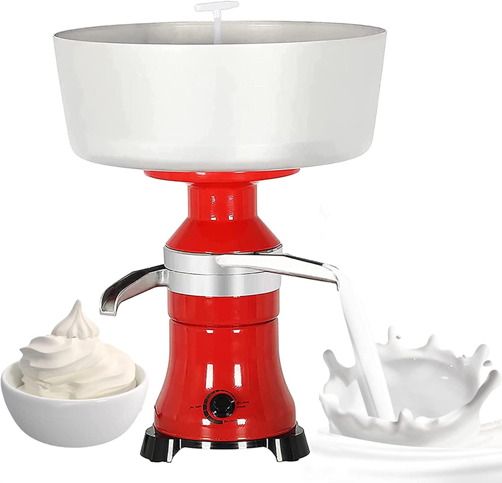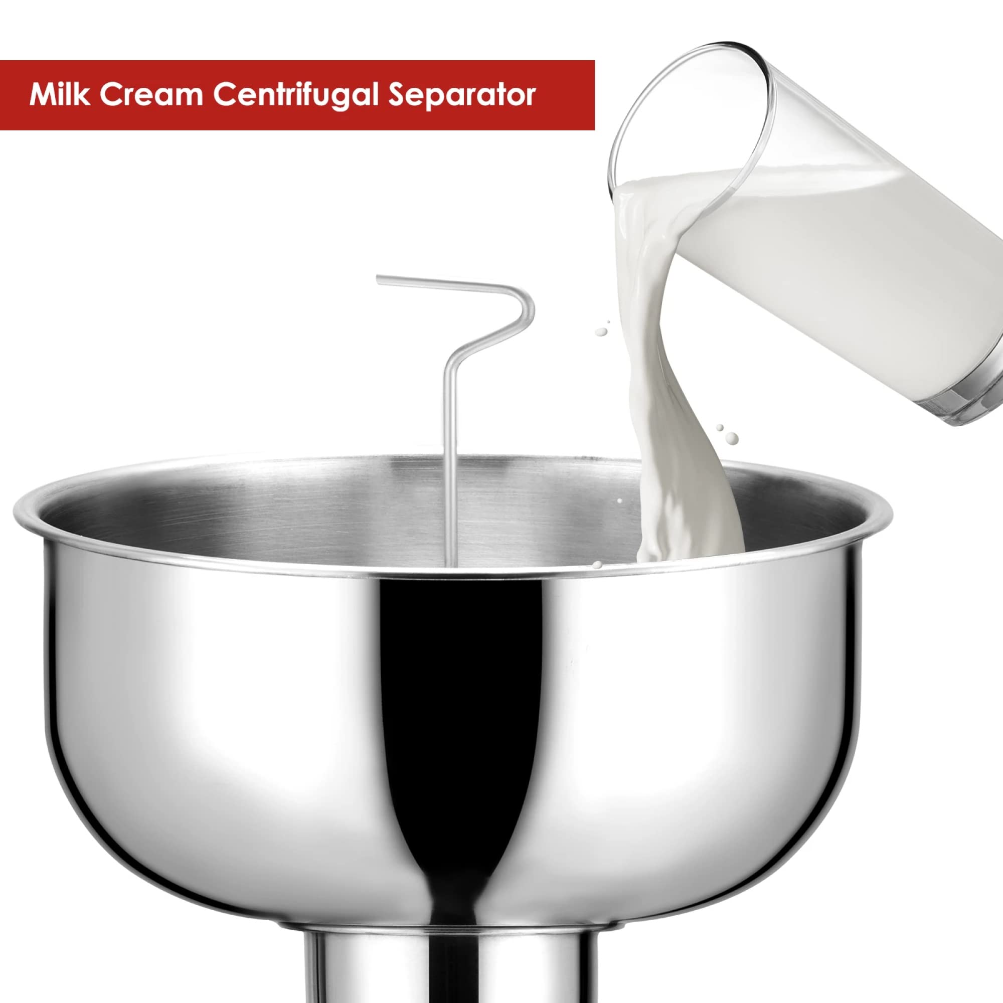 Praktisches Design mit abgewinkelten Ausgüssen, damit nichts überläuft. Ideal für Bauernhöfe, Selbstversorger oder alle, die frische Sahne lieben. Funktioniert mit Kuh- und Ziegenmilch. Mit Transformator für 100-240V.