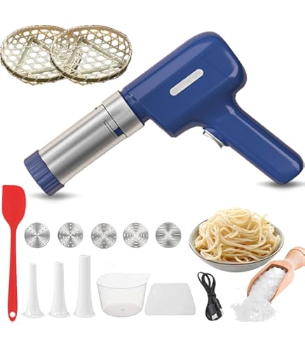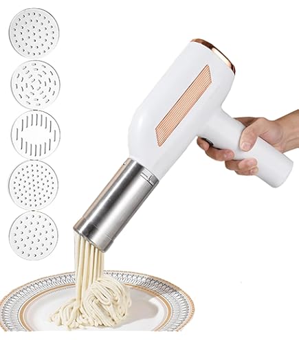Frische Pasta in Sekunden! Diese kabellose Nudelmaschine macht Spaghetti, Linguine & Co. zum Kinderspiel. Mit 5 austauschbaren Aufsätzen für verschiedene Nudelformen. 1200mAh Akku - bis zu 60 Portionen pro Ladung. 200g Nudeln in nur 20 Sekunden! Aus lebensmittelechtem Edelstahl und ABS - sicher und langlebig. Ein-Knopf-Bedienung - super einfach auch für Anfänger. Leicht zu reinigen (abwaschbar) und platzsparend zu verstauen. Inklusive Messbecher und Teigschneider. Perfekt für Familien, Pasta-Liebhaber und gesunde Ernährung. Mach deine eigenen Nudeln - frischer, gesünder und leckerer als gekaufte! Wähle zwischen Weiß und Blau - dein neues Küchen-Highlight wartet!